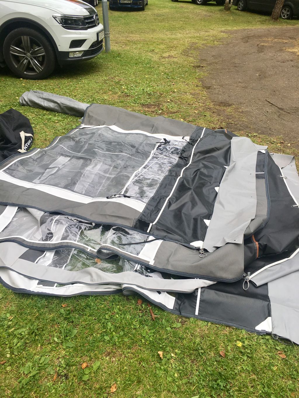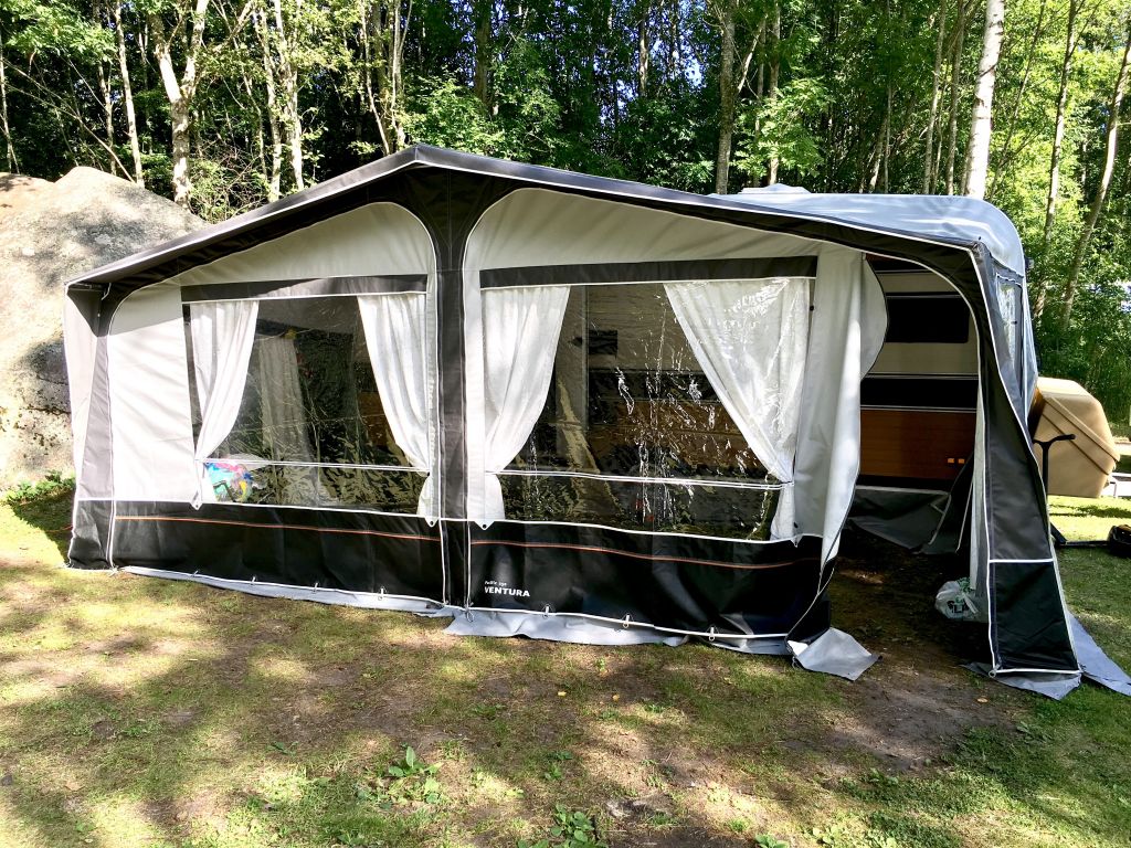 Igår var det dags att testa förtältet. När det ligger utspritt såhär tänker man väl att det aldrig kommer att gå. Vi kommer aldrig få ihop den. Men med svärisarna till hjälp var det nemas problemas. Förtältet är lite för långt för husvagnen men jag ska fråga mamma som är duktig på att sy om hon kan fixa det? Det syns inget på bilden här nedan men den är liksom längre på ena sidan.