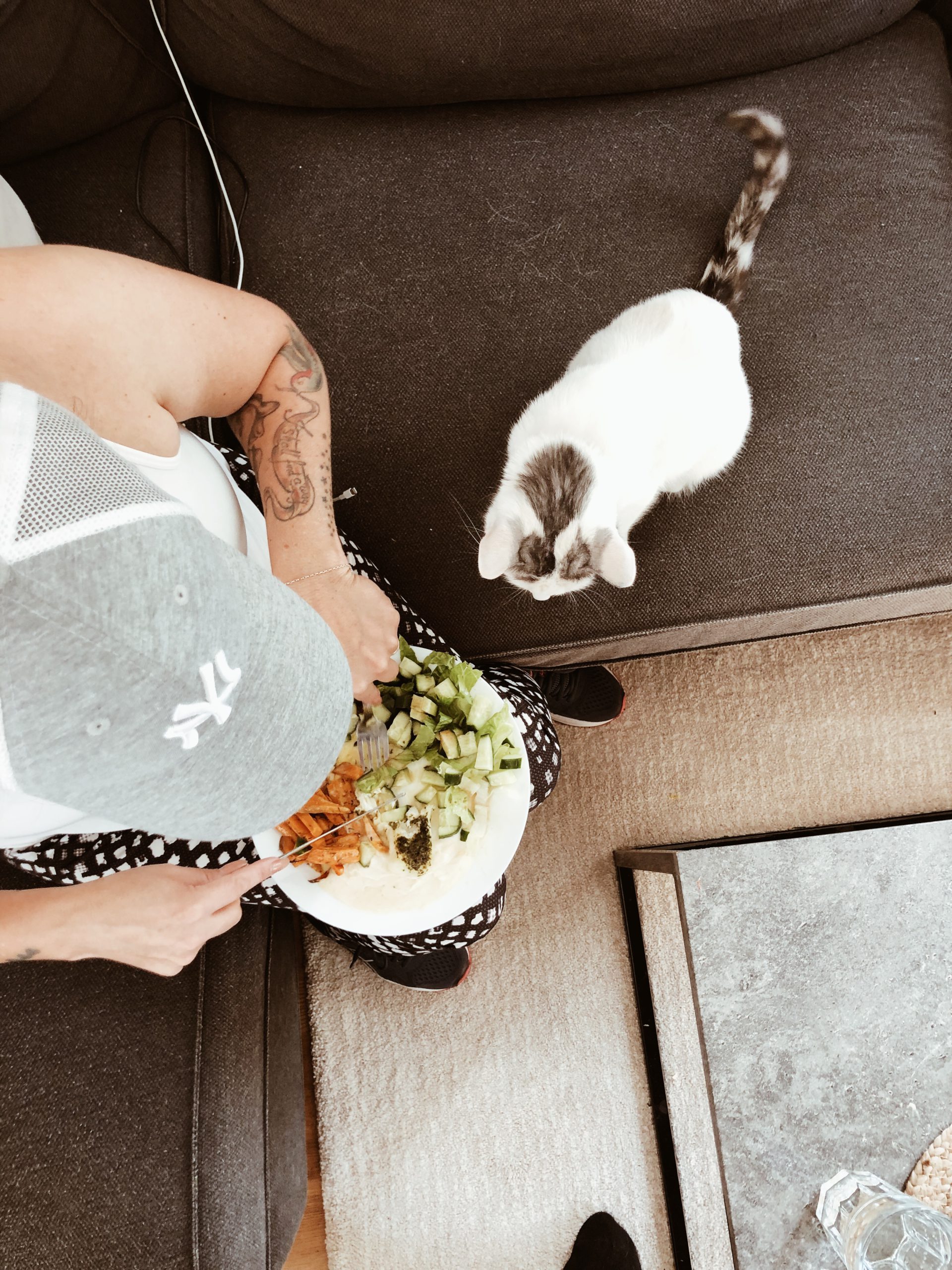 Sedan hem för att laga autoimmun paleolunch. Som vanligt hade jag katten som sällskap. Hon tigger som en hund när jag äter vid soffbordet.