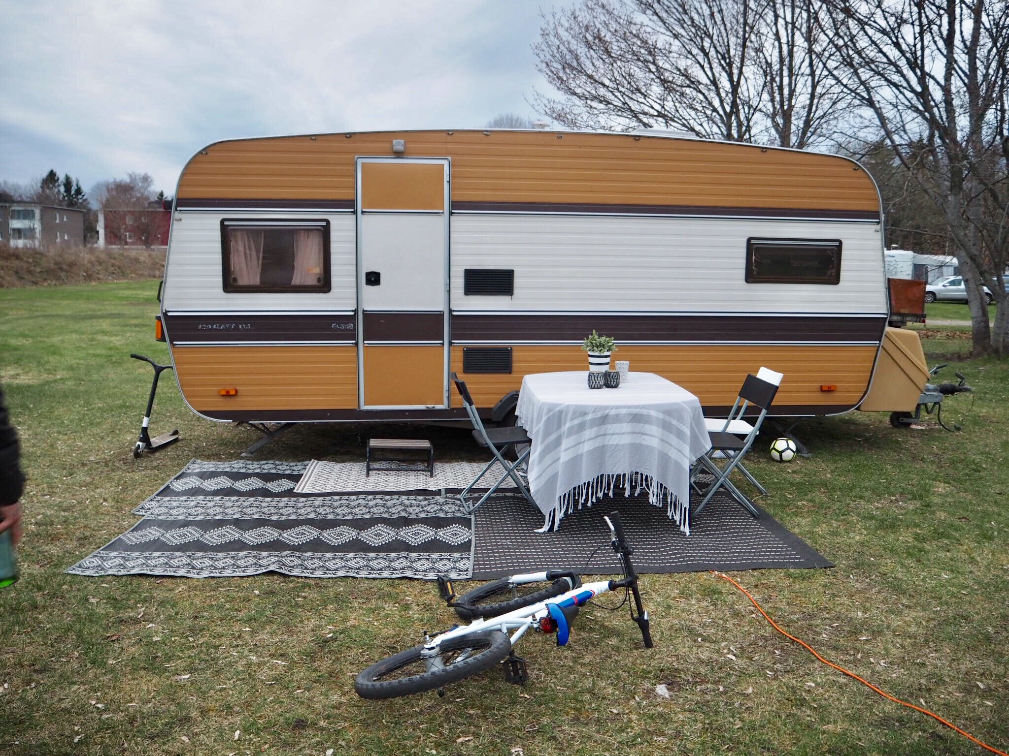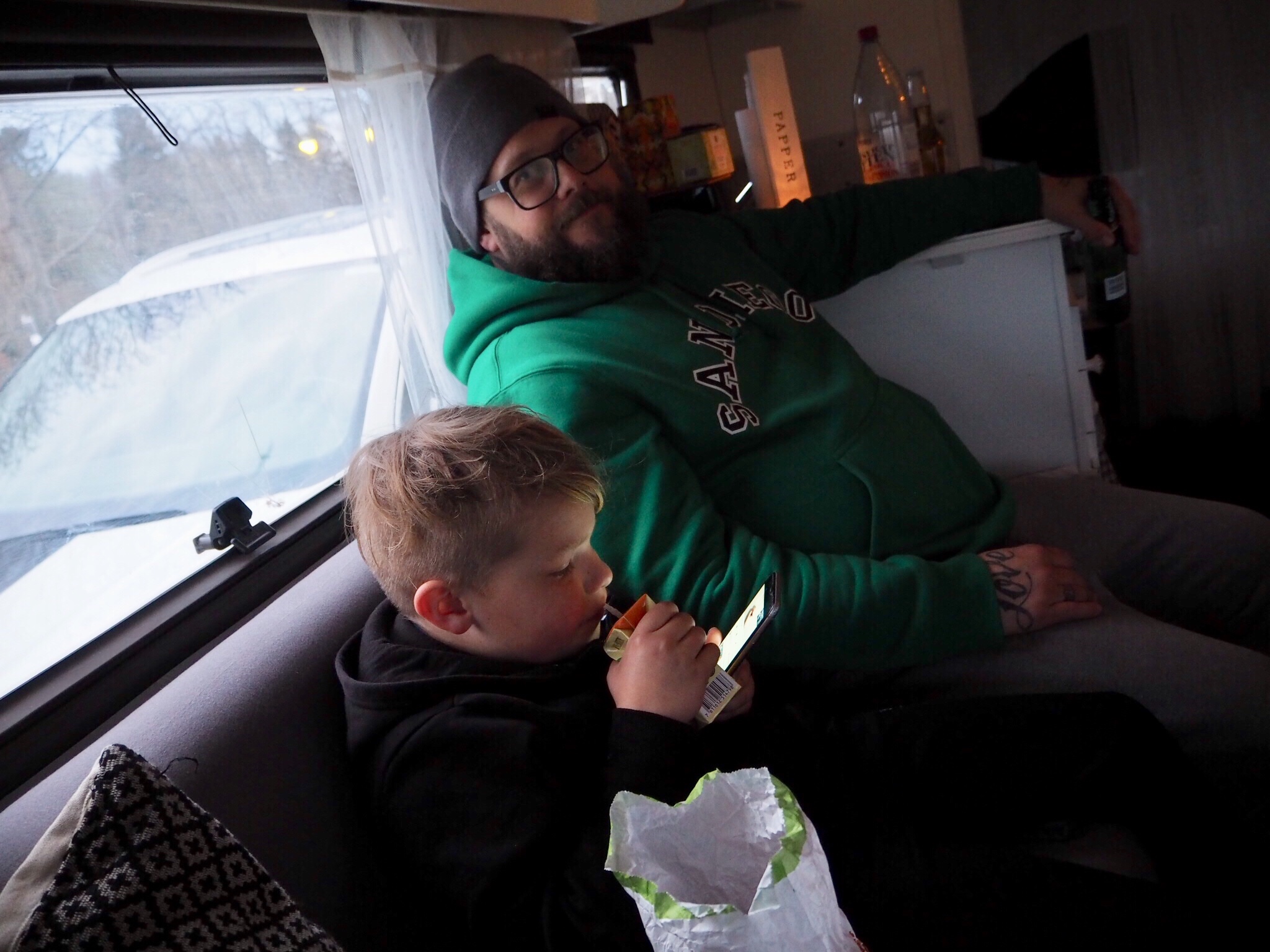 Haha, alltså…. ”Vagnhild”, du må vara fin invändigt men utanpå…. not so much. Vi slängde upp några mattor och bordet med lite stolar bara. Vi orkade inte riktigt bygga upp förtältet för 1 dag. Men i sommar, då ska det upp! Det är som ett extra rum med förtält. Nu har jag också klurat en hel del på hur man ska lösa hur det ska se ut i förtältet. När man inte är långliggare utan reser runt så måste man tänka på vikten i vagnen. Den får inte bli för tung så man får inta ta med för tunga grejer. Men jag är helt uppslukad av det här nu. Haha…. hitta bra lösningar och göra mysigt liksom.