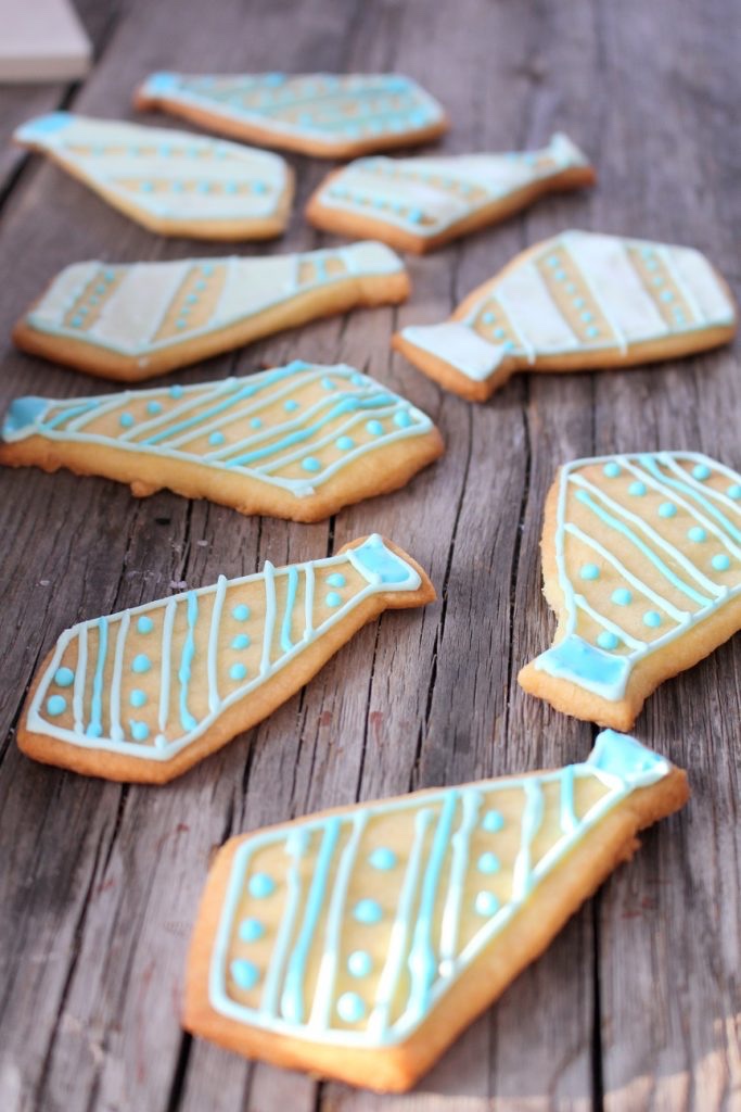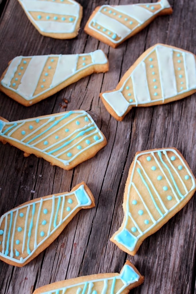 4) Kavla ut degen på mjölat bakbord och skär ur eller stansa figurer. Jag gjorde slipsar. Lägg på bakplåtpappersklädd plåt och grädda i 200 grader i ca 6-8 minuter, de ska nätt och jämnt börja få färg. Ta ut och llåt svalna medan du gör glasyren/kristyr.