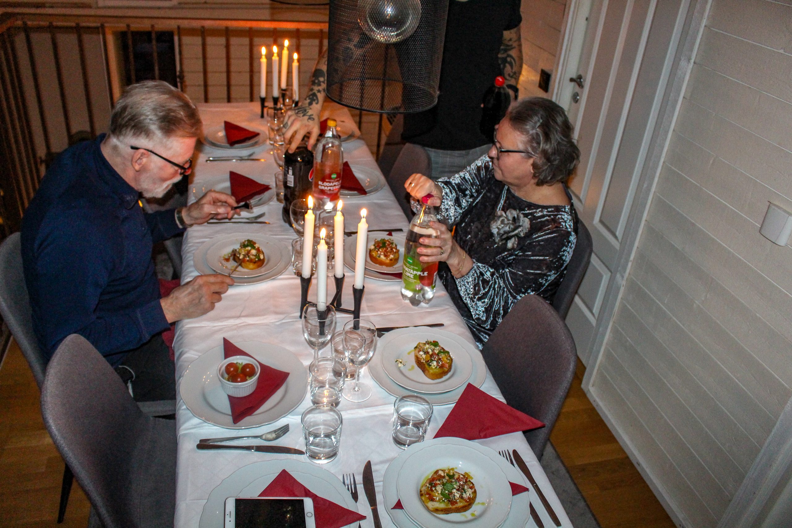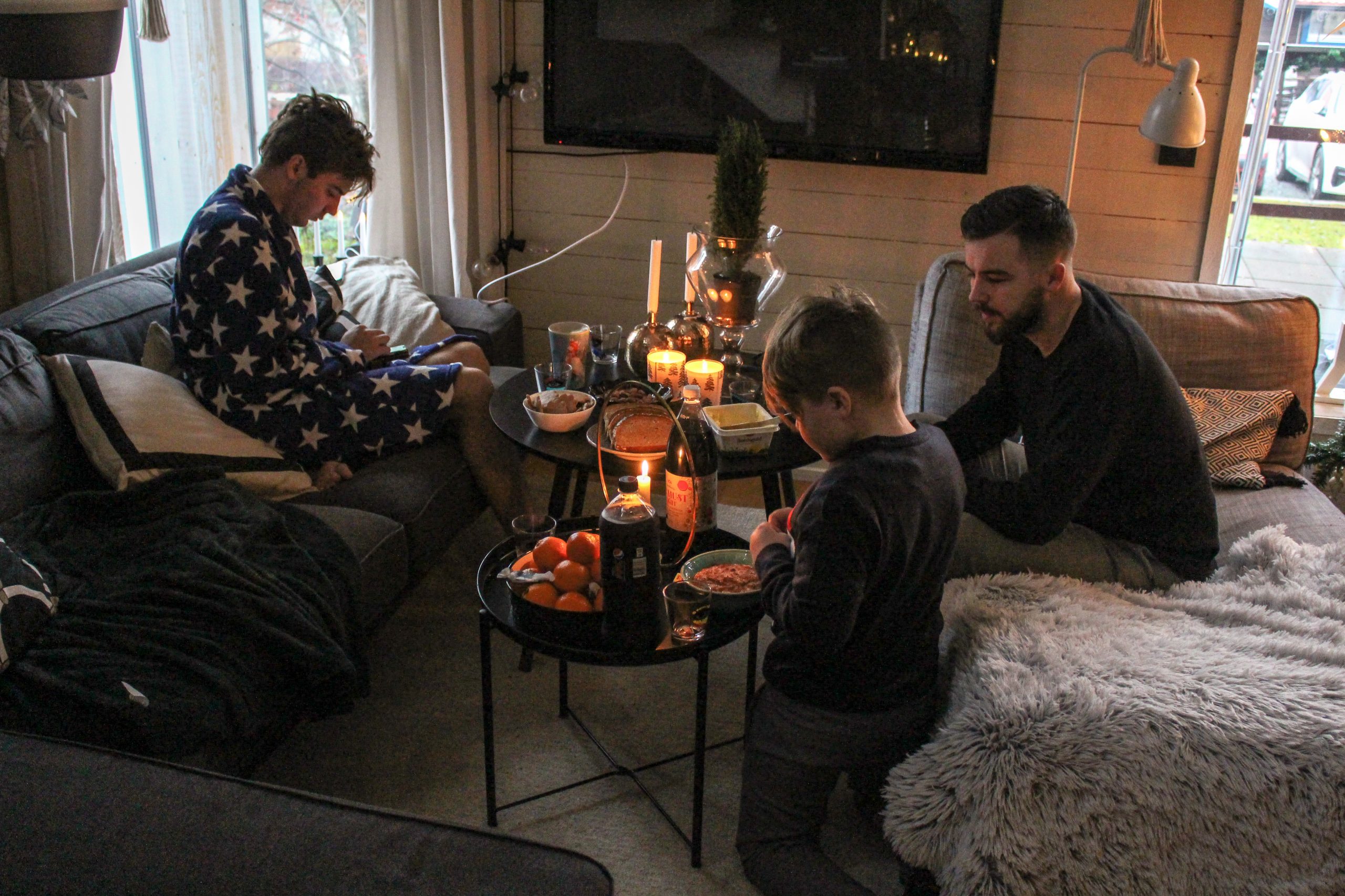 Lagom till Kalle skulle börja tog vi vårt pick och pack bokstavligen och gav oss av mot Tonys bror Hasse med familj. Där var det så himla mysigt dukat och julen stod högt i tak. Vi hade bestämt innan vad alla skulle göra med sig. Vi hade prinskorv, jansson och efterrätt på vår lott. Till mig själv gjorde jag rotfruktsgratäng, vegansk sill och en vegansk julskinka.