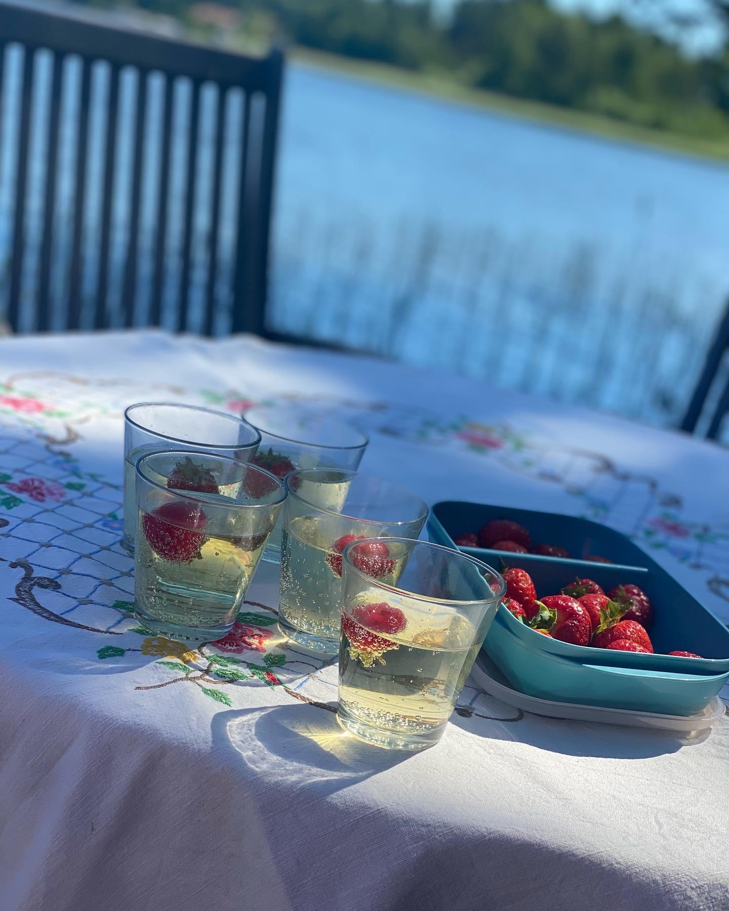Fast vi började med att skåla i cider och äta jordgubbar. Så mysigt det var när solen gassade på oss där på bryggan.