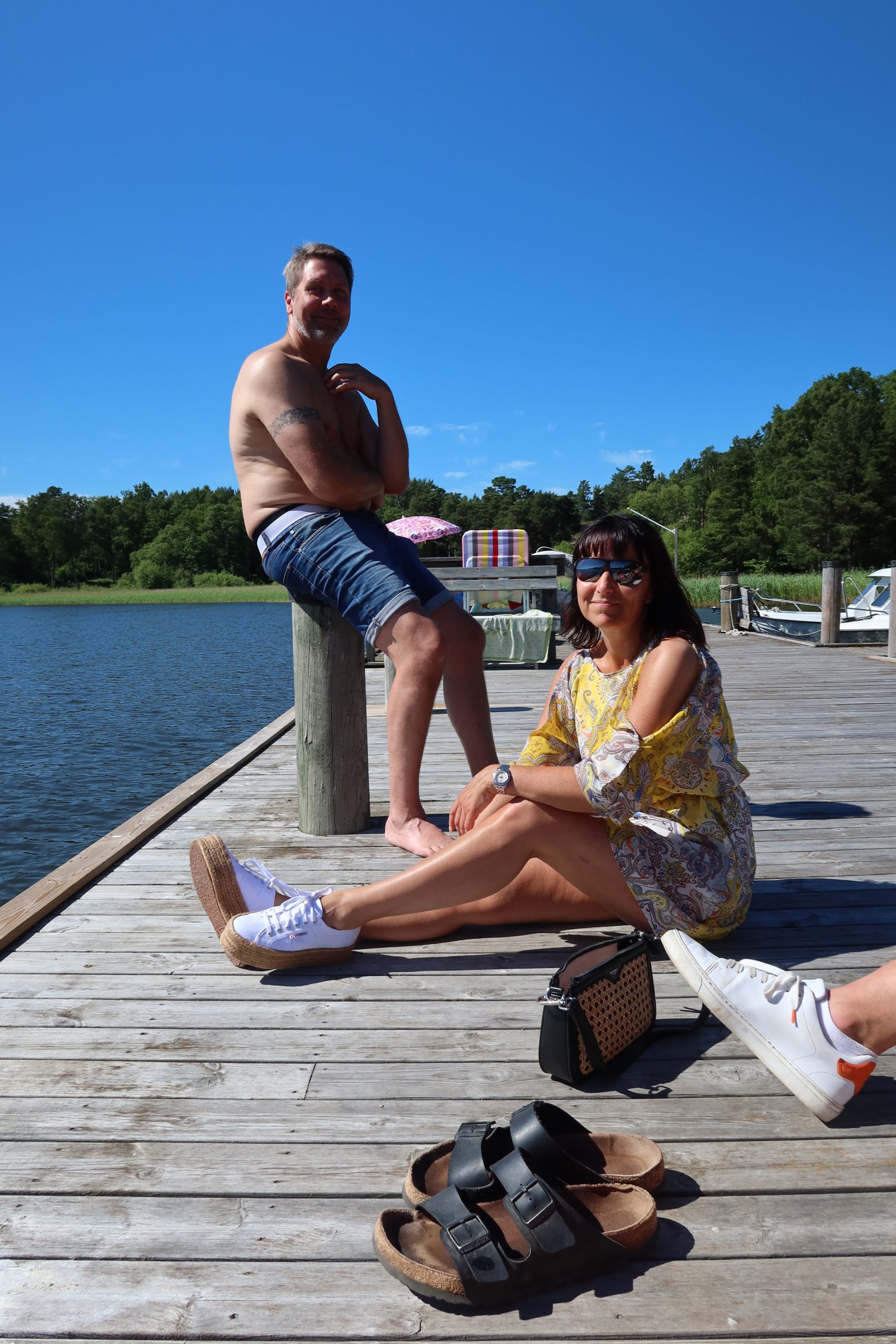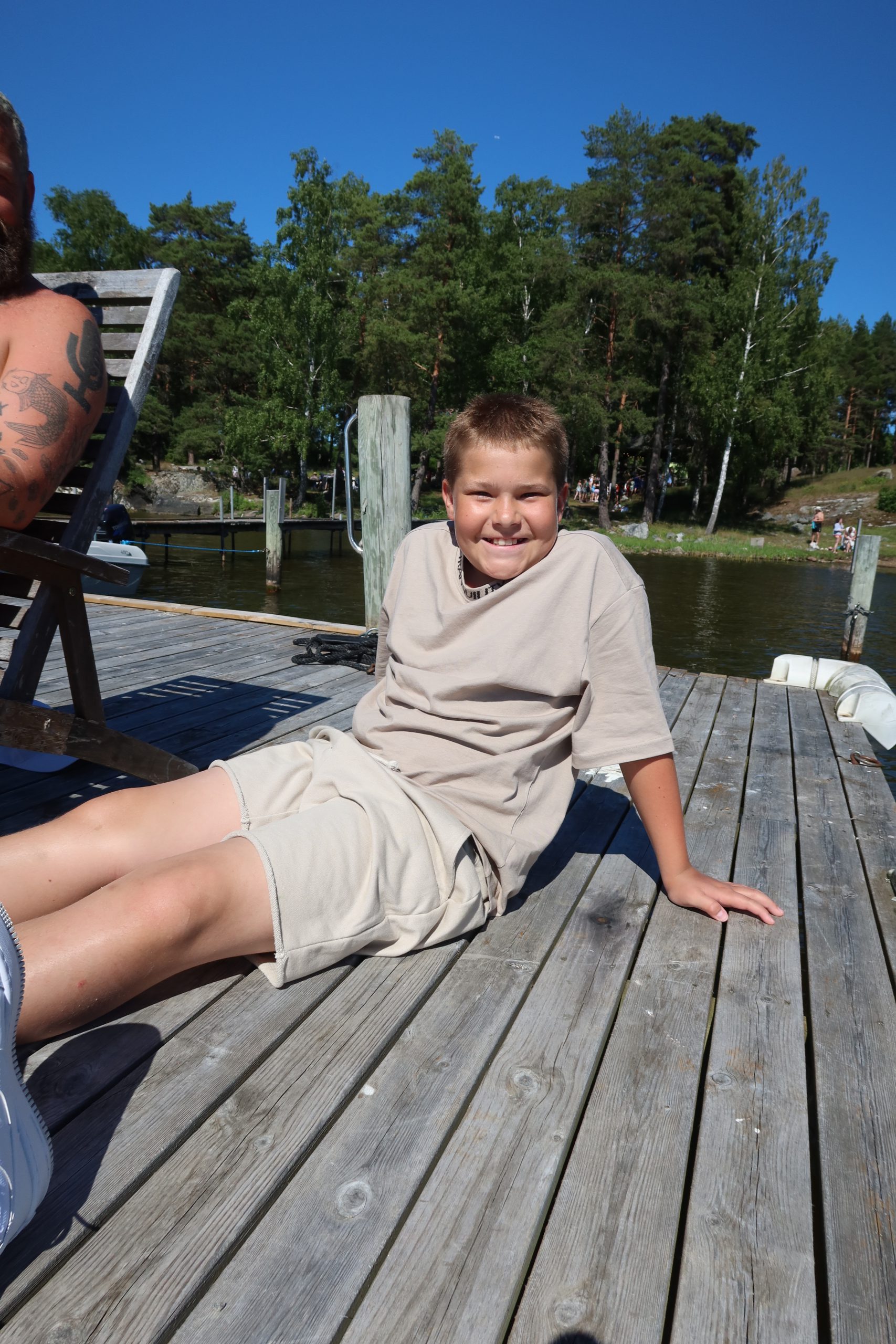 Vi satte oss på bryggan och lyssnade på sång och tittade på dans runt midsommarstången. Tony tog med en boxboll som vi hade väldigt roligt åt. En sån som man fäster runt huvudet. Blev också bad och hopp i från bryggan.