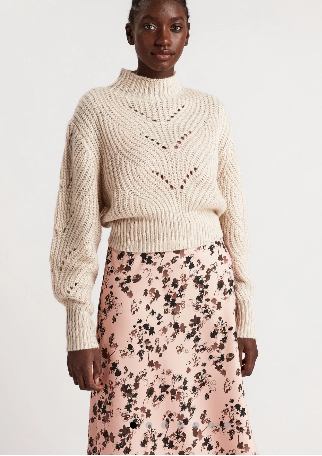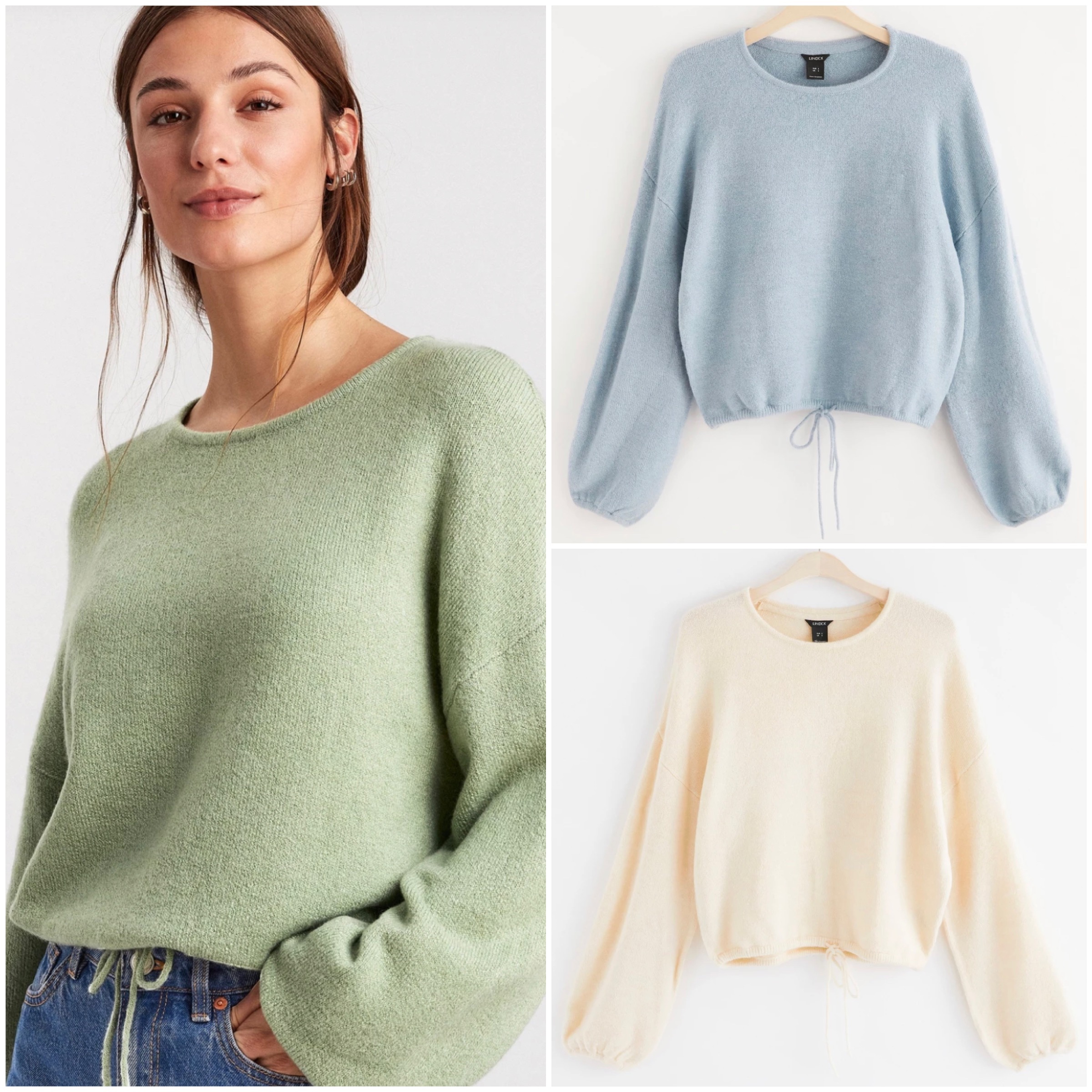 Kolla bara in de här pastelliga tonerna på kanske världens härligaste tröja! Vill ha! Älskar knytningen i mudden, älskar ärmarna, älskar materialet!