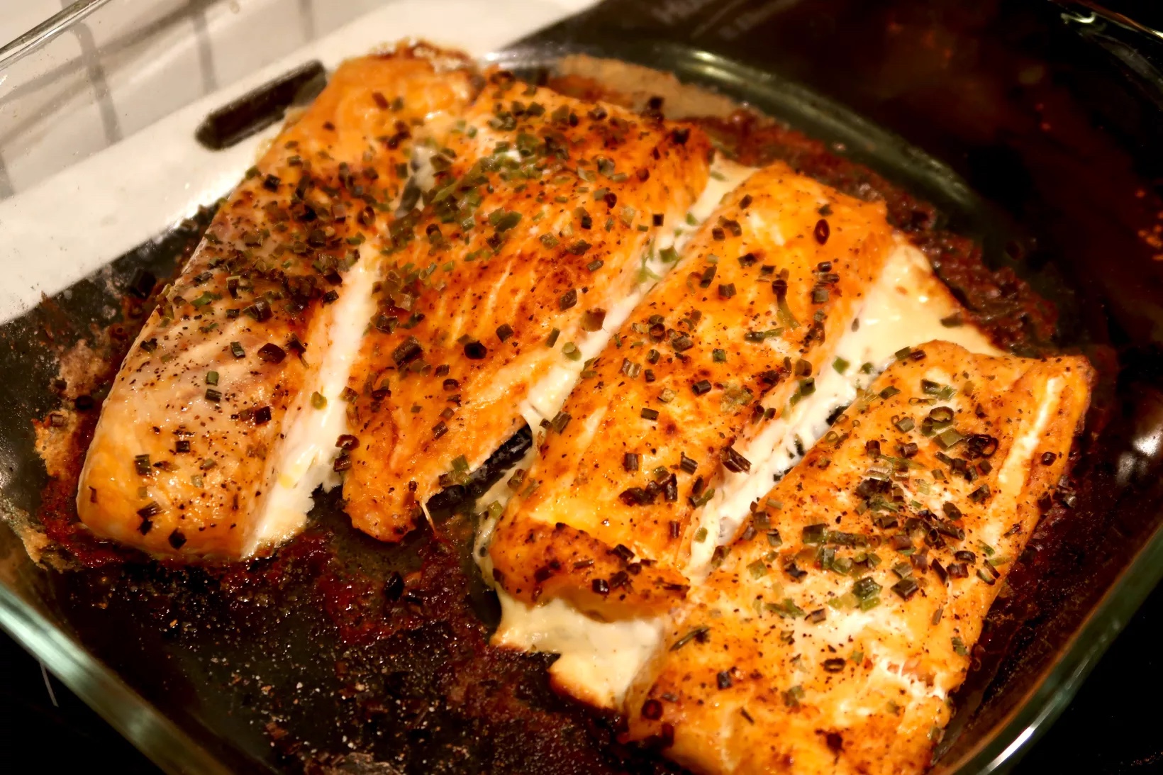 4) Ta ut fisken från ugnen. Häll över såsen, riv på parmesanen och rör om lite med en gaffel så såsen och parmesanen blandar sig lite, och skjutsa sen in i ugnen i 15-20 min.