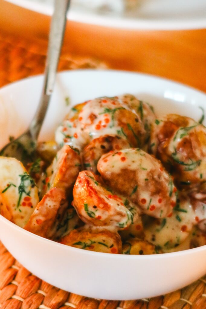 Den här potatisrätten är perfekt att äta till kött, kyckling, eller som vi gjorde – ha den på buffébordet!