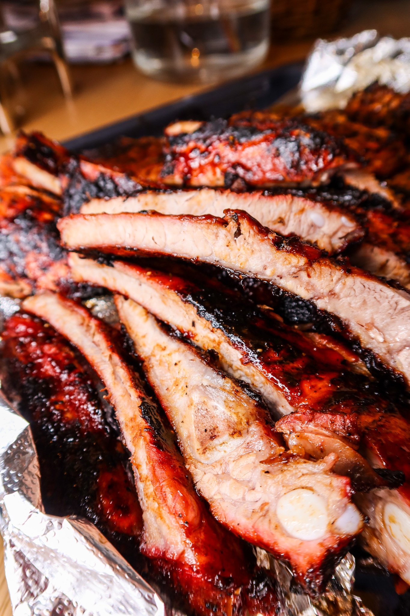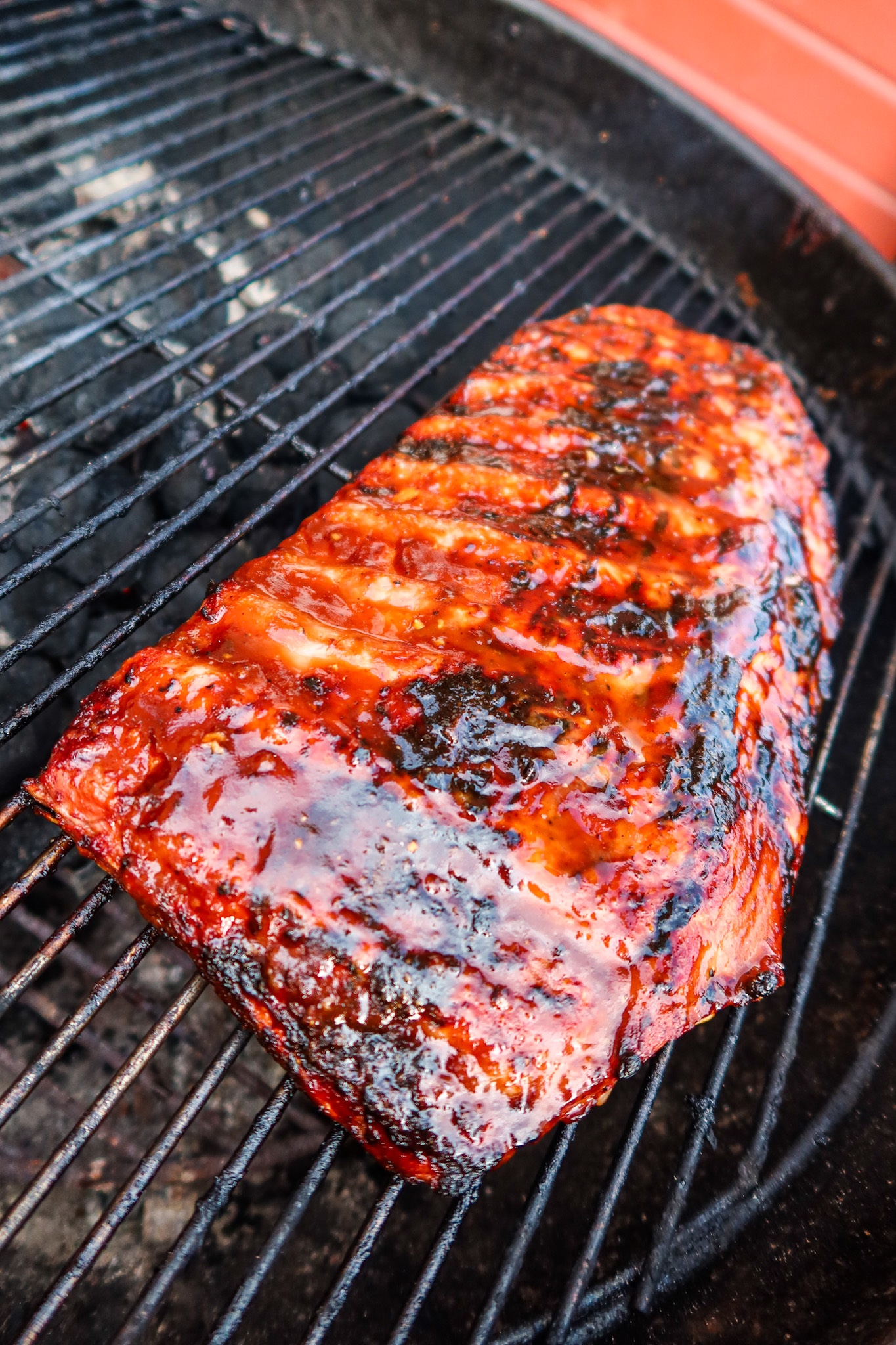 Sätt igång grillen, ha kålen på ena sidan grillen. Köttet ska alltså inte ligga rakt på kolen utan bli indirekt grillad. Pensla in ribsen ordentligt med marinaden/glazen på båda sidor. Klä in ribsen med folie. Lägg på grillen (den ska hålla en värme på ca 140 grader). Lägg foliepaketet med ribsen på ena sidan av grillen, på med locket. Låt sedan grillen gå i 2 1/2 timma. Ta ut dem sedan och ta bort folien, pensla på mer glaze och lägg sedan på den på grillen men nu på direktvärme. Ribsen ska alltså bli sådär härligt karamelliserade och få riktigt fin färg.