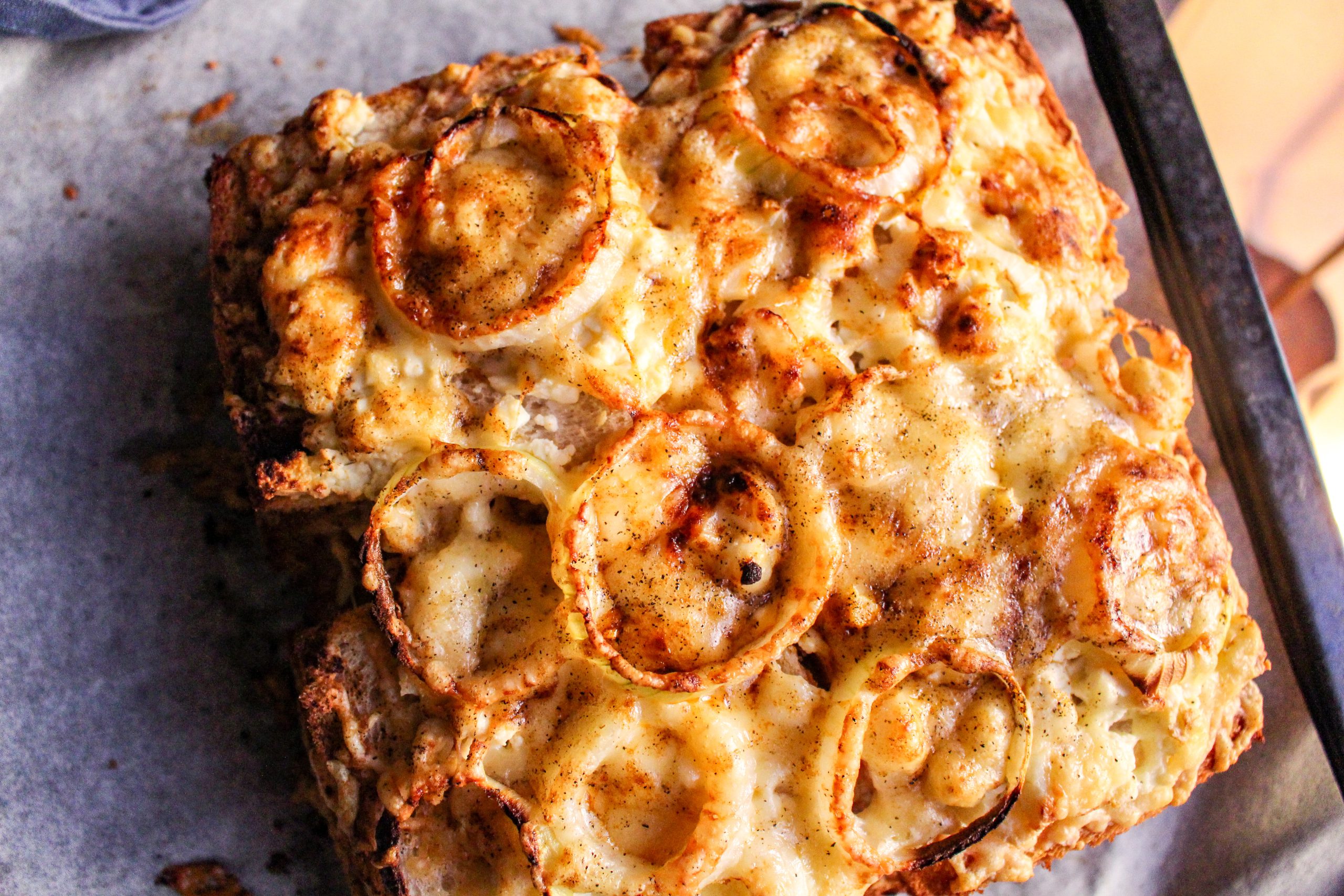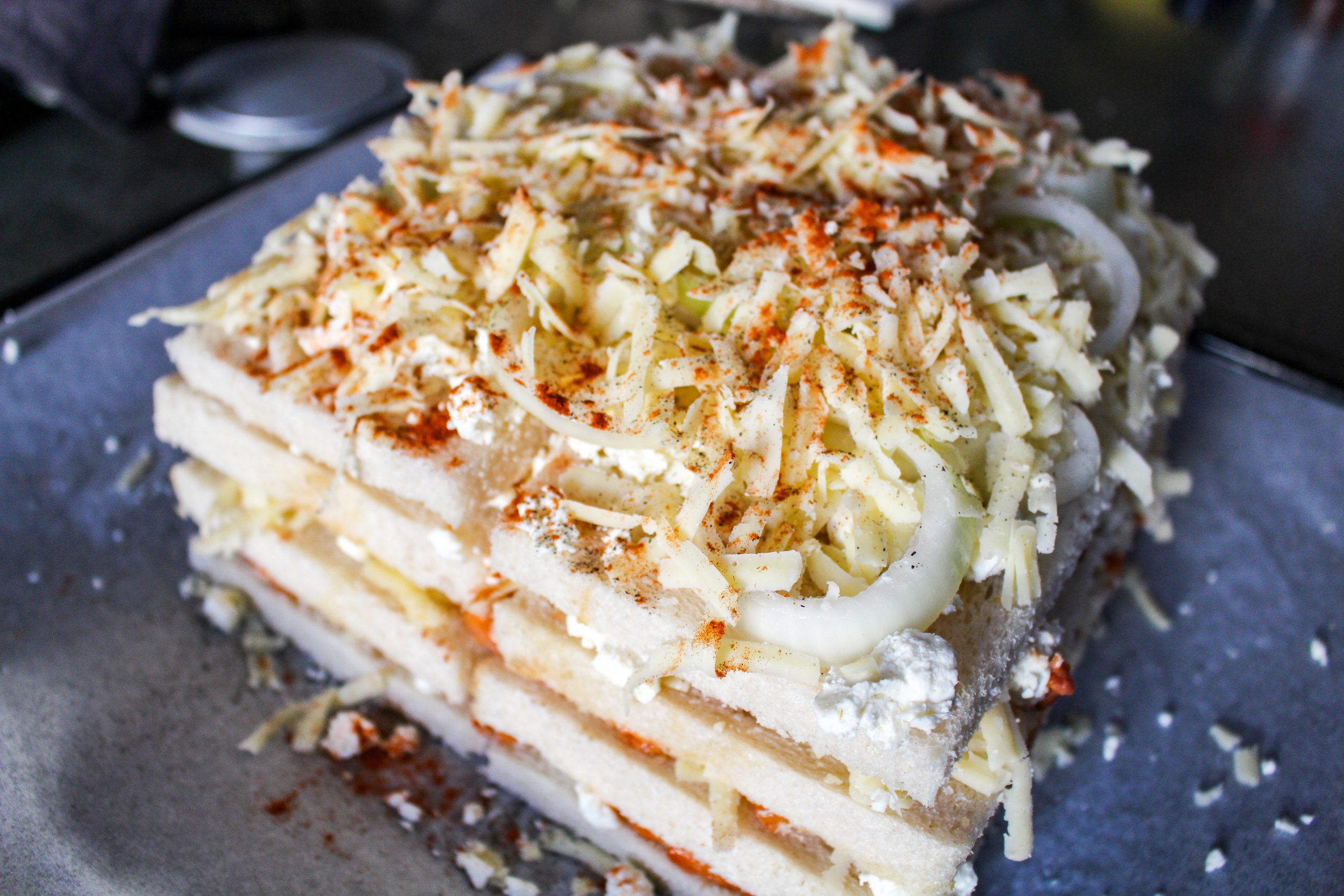 7) Toppa med fetaost, skivad lök och riven ost. Krydda med svartpeppar och paprikakrydda.