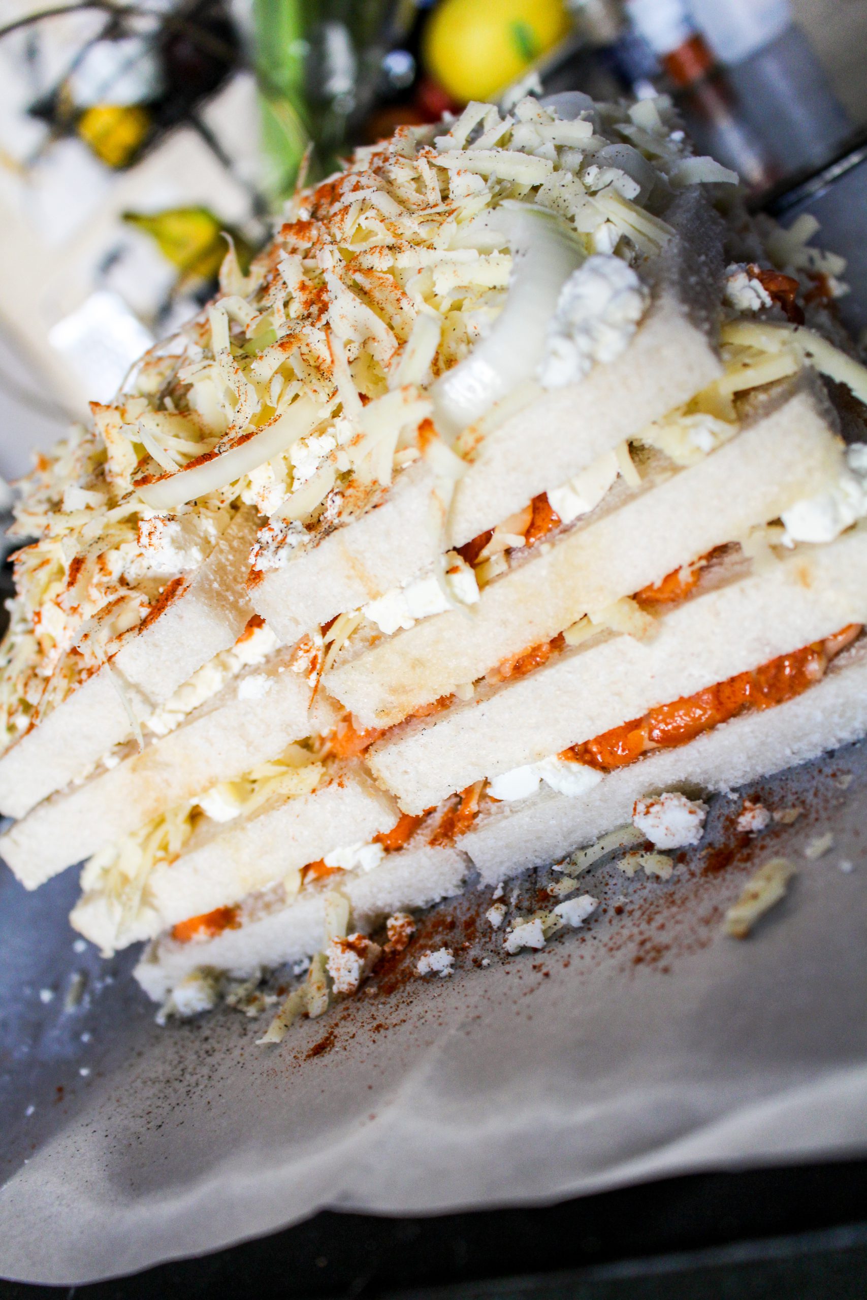 6) Bygg likadana lager tills du har 4 lager bröd och 3 lager med fyllning.