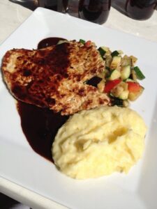 Utbankad benfri fläskkotlett med potatispuré och rödvinsky.
