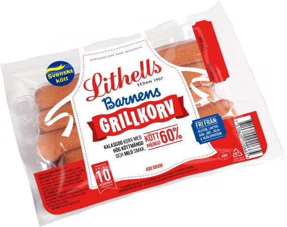 Den här kryddiga korvstroganoffen är en höjdare i husmanskostväg. Smakerna gör att den smakar lite ”flashigare” än vad det är med korvstroganoff som enligt mig är en riktig vardagsrätt. Till den här rätten använde jag ”Lithells Barnens grillkorv”. Den är fri från gluten, laktos, ägg-, ärt-, soja- och mjölkprotein. Den ser ut såhär: