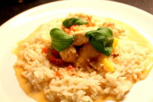 4) Häll i kycklingen och paprikan i en ugnsfast form. Häll över gräddblandningen över kycklingen. Ställ in i ugnen på 200 grader i ca 15 minuter eller tills gräddblandningen fått lite färg. Servera med ris och grönsallad. MUMS!