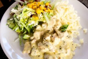1) Börja med att skära kycklingfiléerna i mindre bitar. Stek i smör tills de är genomstekta.
