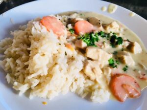3) Blanda majsstärkelse, grädde, färsk och torkad timjan, kycklingfond och vitt vin. Häll på det på kycklingen. Låt småputtra i ca 10 min. Skulle det bli för tjockt kan du hälla på mer vatten. När det är klart klipper du på lite färsk persilja.