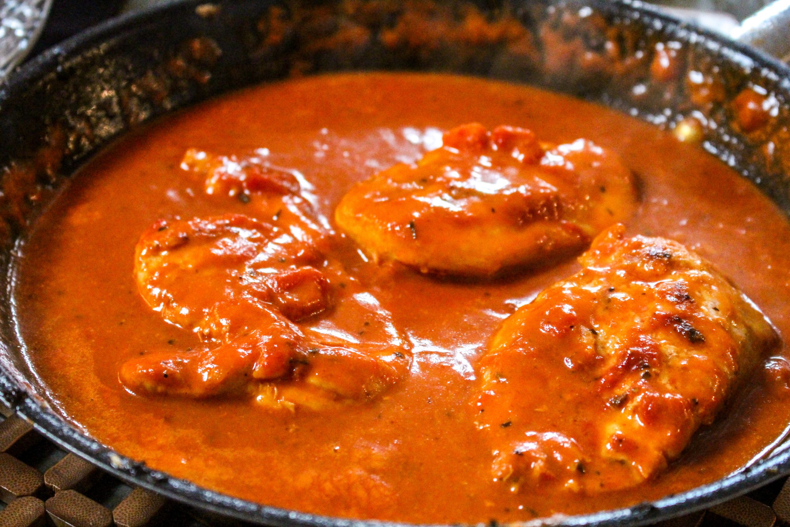 1) Stek kycklingfiléerna i olivolja. Salta och peppra dom lite lätt. De ska vara helt genomstekta och få lite färg på ytan.