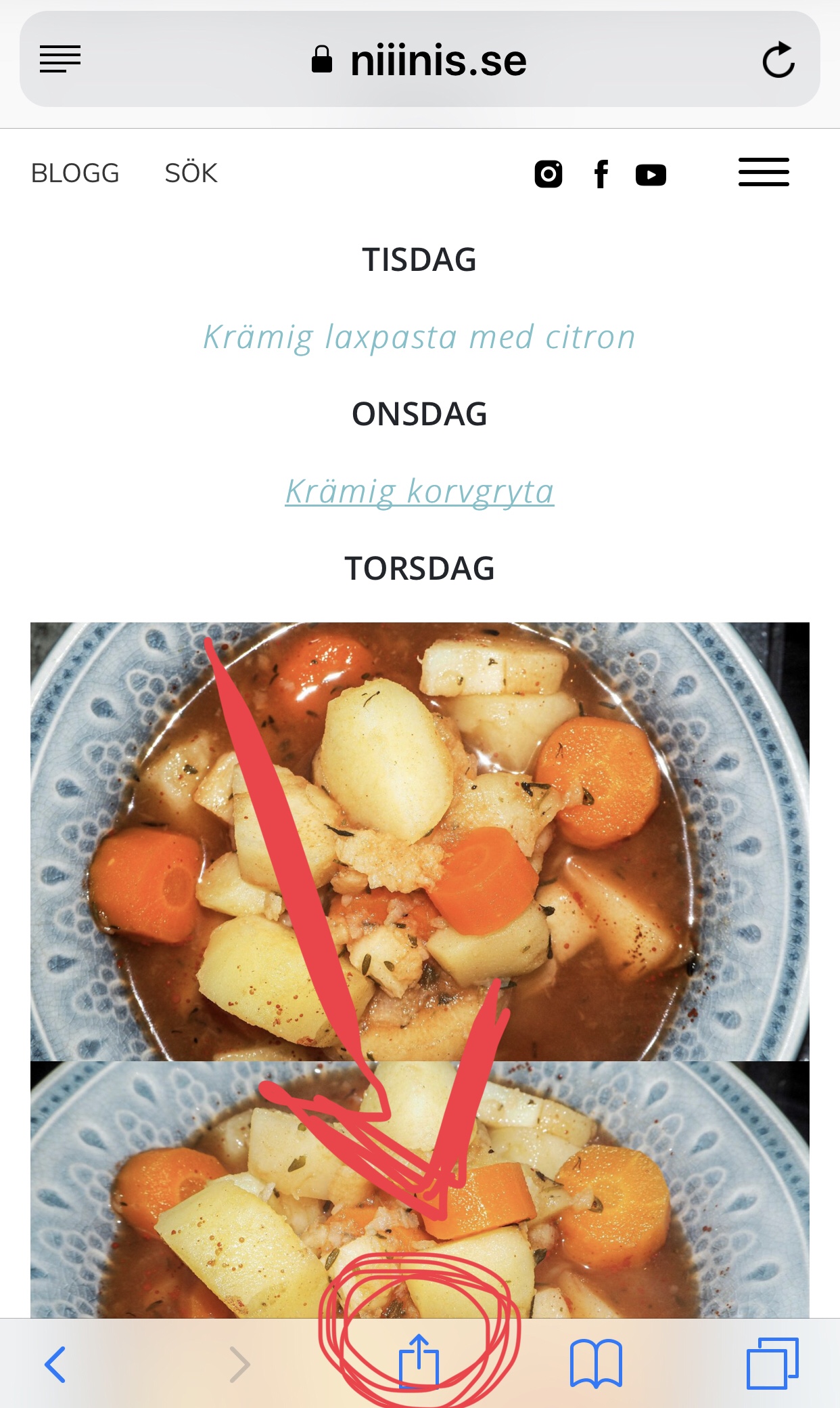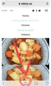 När du är inne på t ex min blogg och veckomatsedeln så ska du först klicka på rubriken i mitt inlägg. När du gjort det så kommer du in på själva inlägget så att säga. Längst ned på din telefon (ja de allra flesta besöker bloggen ifrån sina telefoner) så har du en fyrkant med en pil uppåt.