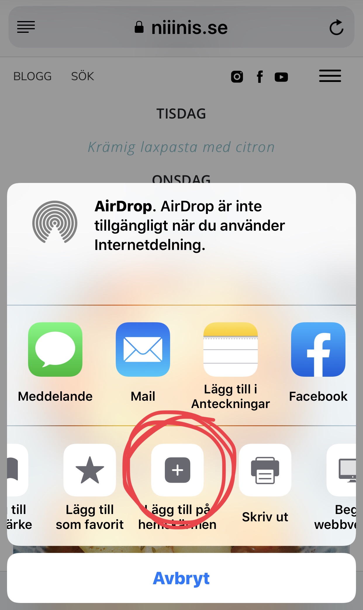 Tryck på den…. då kommer det upp olika ikoner, scrollar du till höger på ikonerna som är längst ned kommer du till slut fram till en som heter ”LÄGG TILL PÅ HEMSKÄRMEN”.