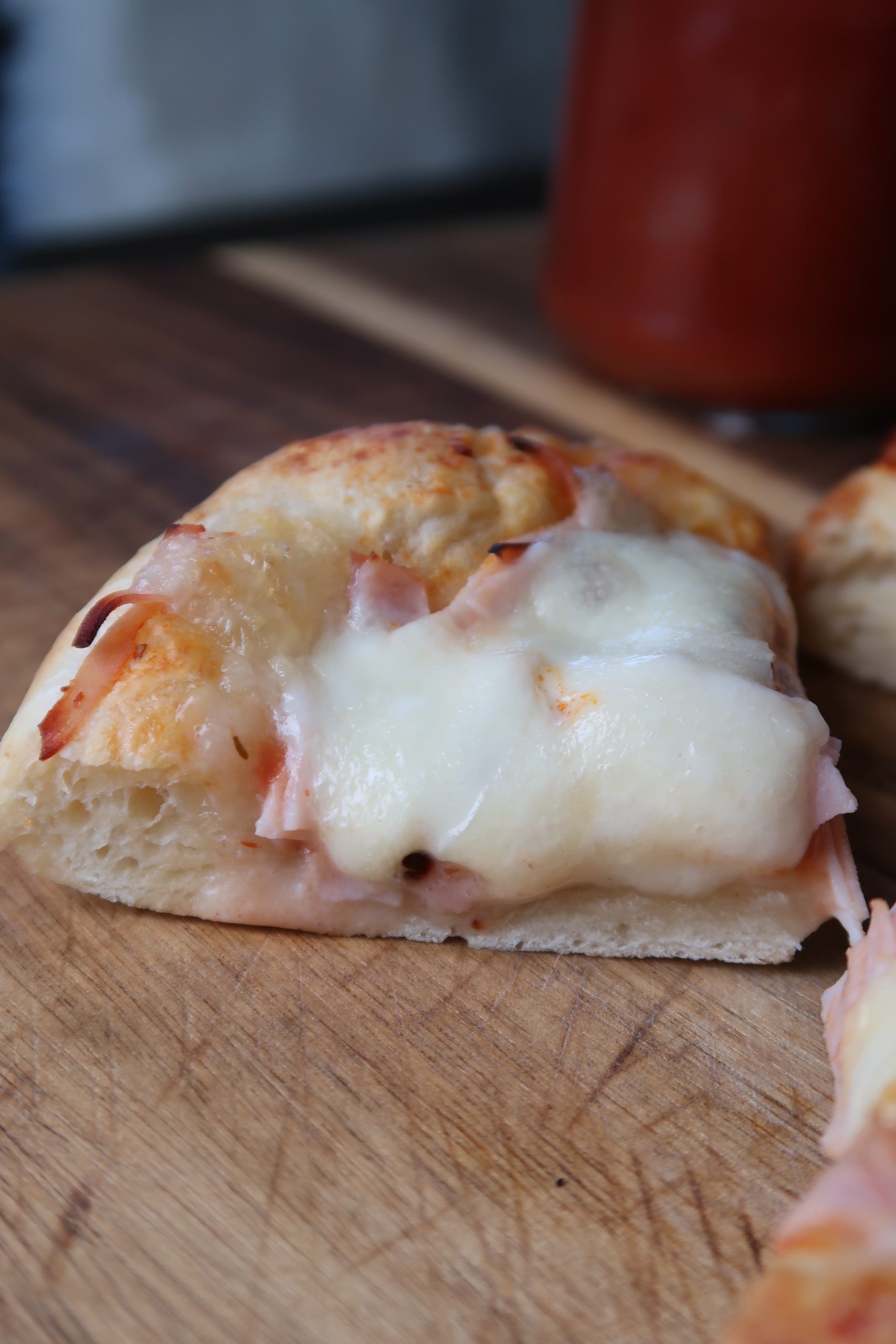 3) Ha på tomatsås, strimla skinkan och ha på den. Avsluta med hackad mozzarellaost.