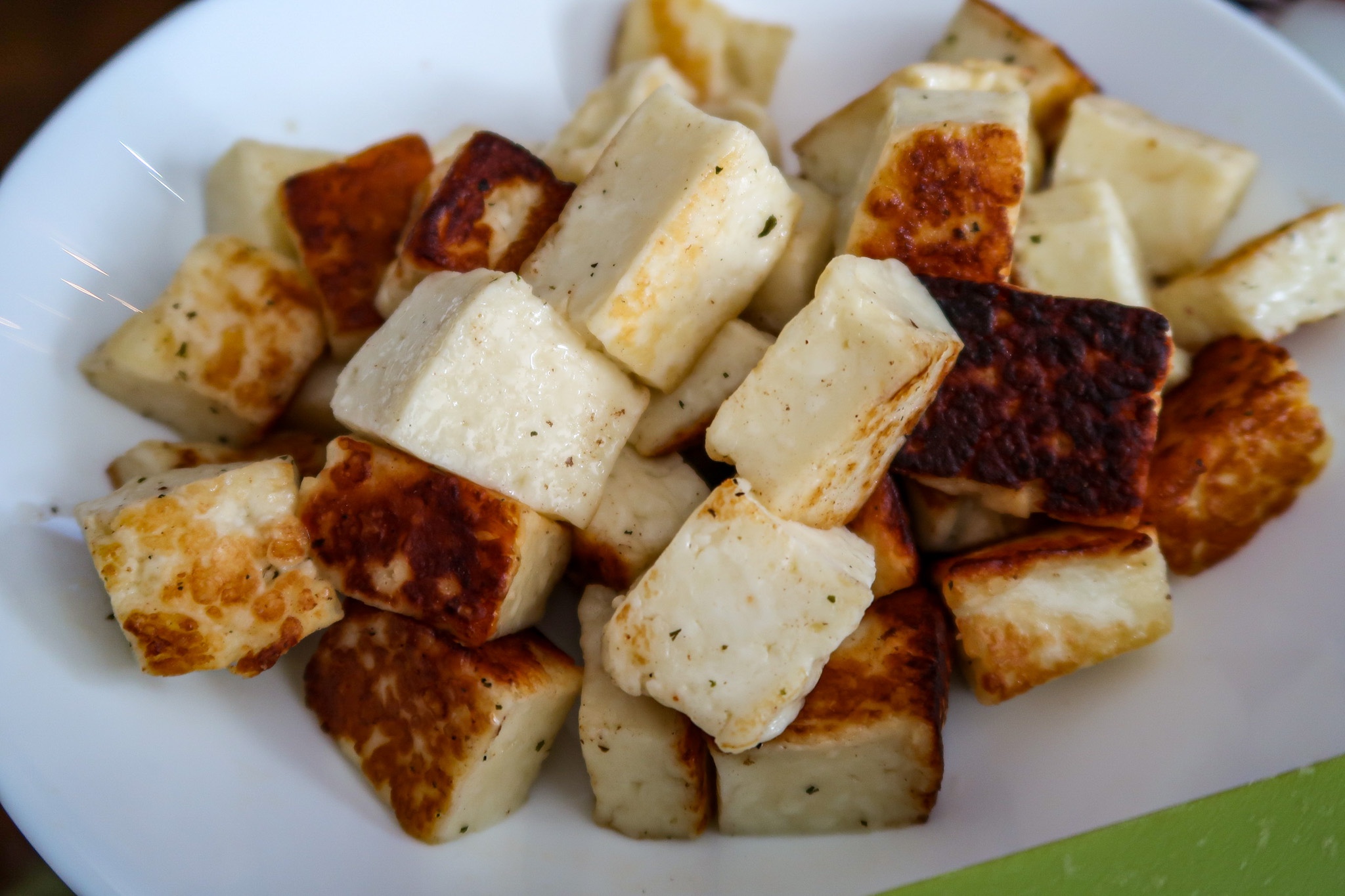2) Tärna halloumi i lagom stora bitar. Hetta upp lite olivolja i en stekpanna. Stek halloumin på medelhög värme, det ska få lite färg.