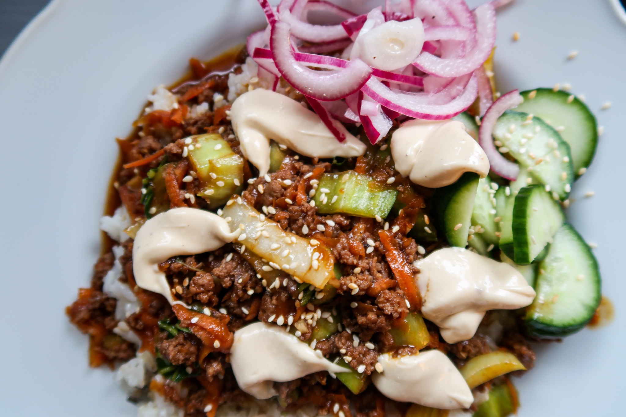 8) Häll av lagen från rödlöken. Lägg upp i ris i en skål och ha på japansk nötfärs, picklad rödlök, sesamfrön, asiatisk majonnäs och gurka.