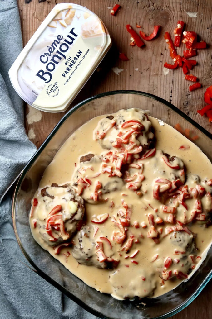 Ost & baconfyllda köttfärsbiffar i parmesansås (<klicka)