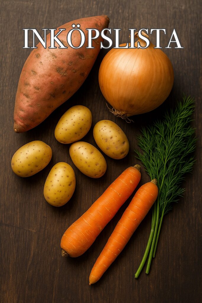 Grönsaker & frukt: potatis, sötpotatis, morötter, salladslök, vitlök, röd paprika, gul lök, schalottenlök, citron, dill, broccoli, cocktailtomater, palsternacka, soltorkade tomater, äpplen, färska örter (timjan, basilika, oregano, persilja)