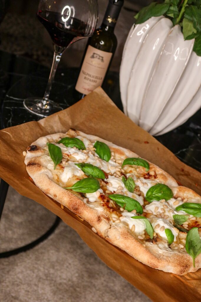 Varmrätt: Pinsa bianco med burrata, basilika & honung »