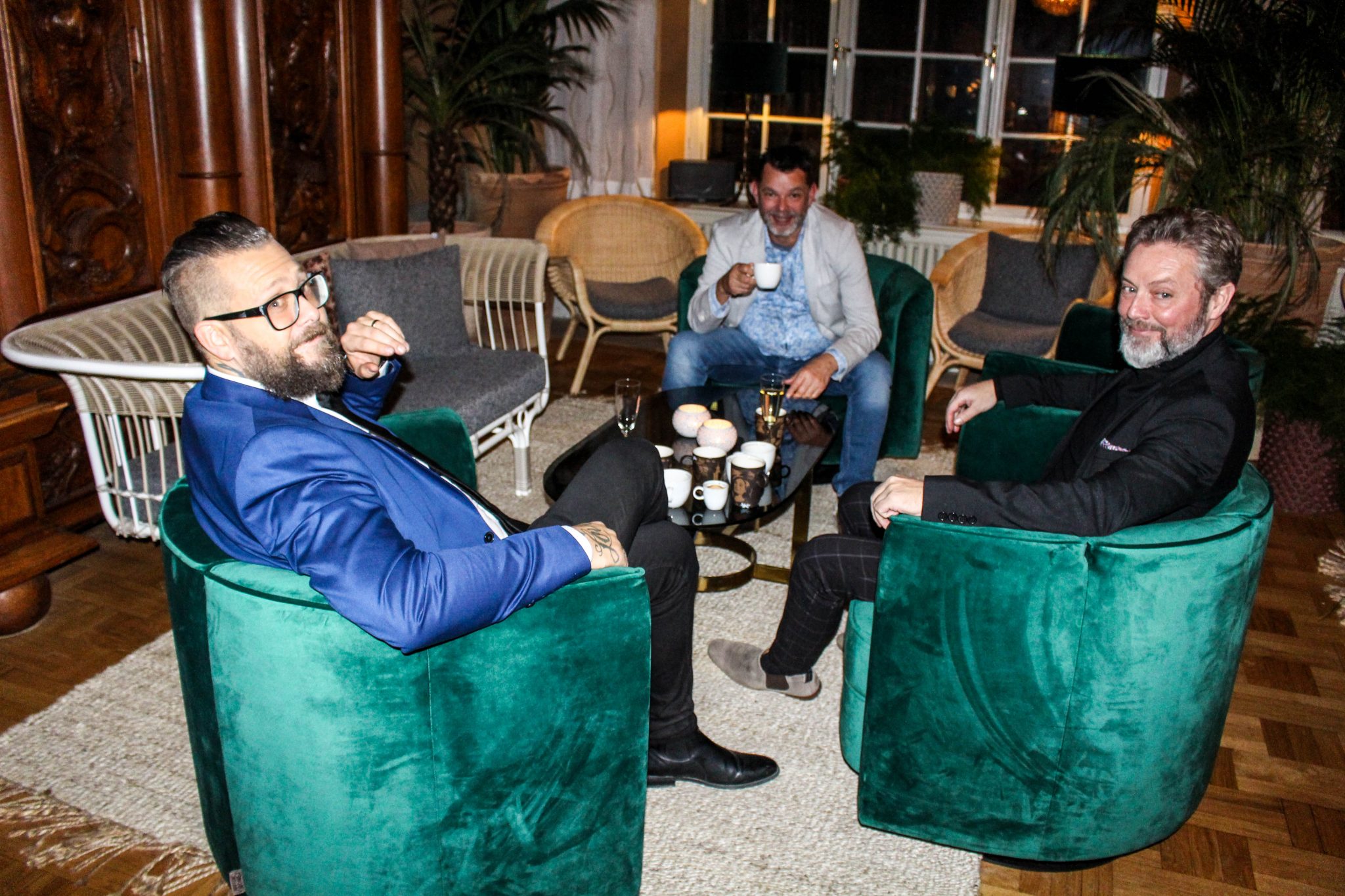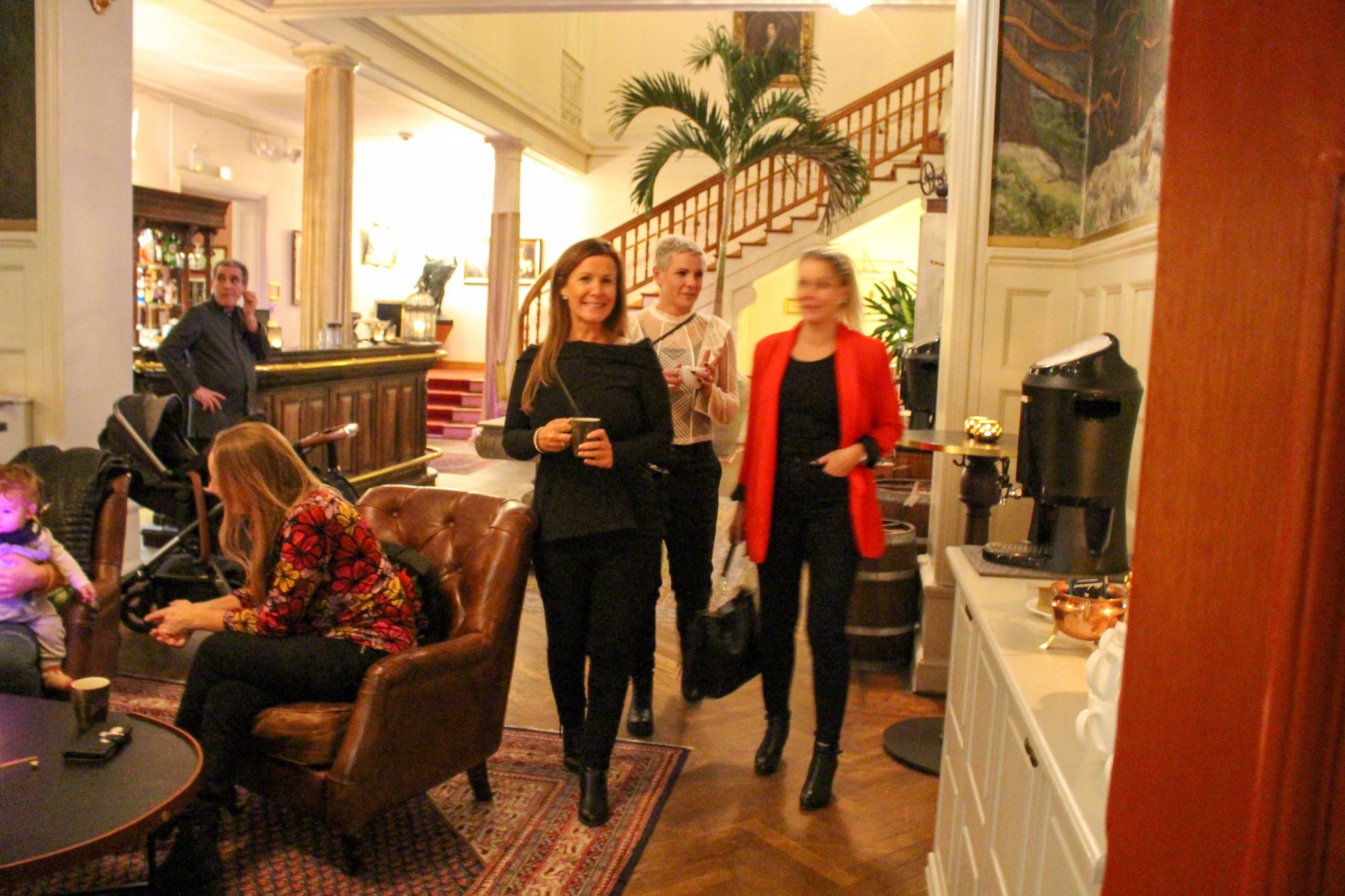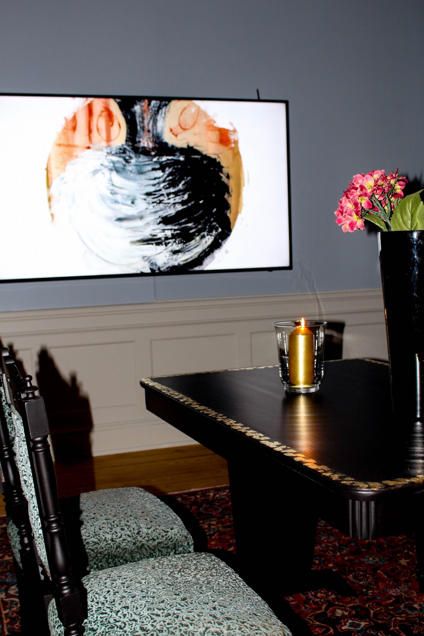 Möblerna stod uppställda och klara. Jag blev så himla glad över att Tony fixat en powerpoint med mina målningar i ett av rummen. Det blev så effektfullt. Han arbetar ju med att sälja konferenslösningar och kan ALLT när det kommer till att ordna så det blir proffsigt och snyggt. Han gav Näsby Slott massor med beröm för att de hade top notch lösningar för konferens (FAST han inte sålt dem själv. Hahaha….)