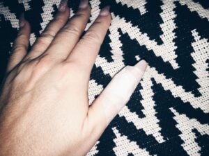 Jag skulle köra en hylla på en purra, då hyllan håller på att tippa skulle jag vara snabb och putta tillbaka den. Då gjorde det sjukt ont i lillfingret, upptäcker då att nageln står rätt upp!!!