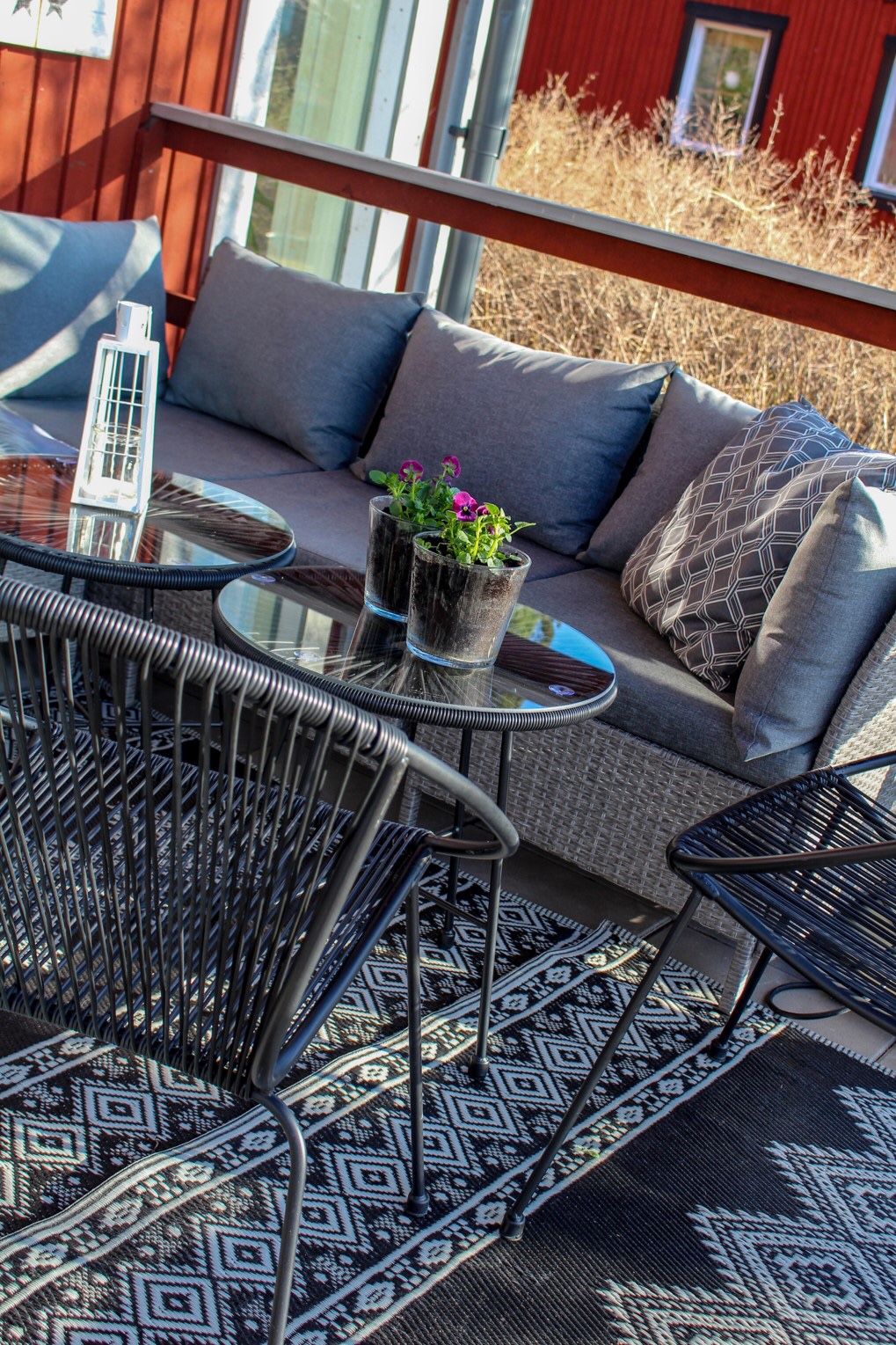 Jag meckade ihop de nya möblerna till altanen. Alltså, woooooow så himla fint det blev. Jag är sååååå nöjd! Dessa två stolar och de två borden passar som handsken och ger mycket mer plats än de plastfåtöljerna vi haft där. Borden hittar du >>HÄR<<, stolarna hittar du >>HÄR<<. Finns också en jättefin liten soffa till >>HÄR<<. Jag fick inte plats med den, annars hade jag beställt den också.