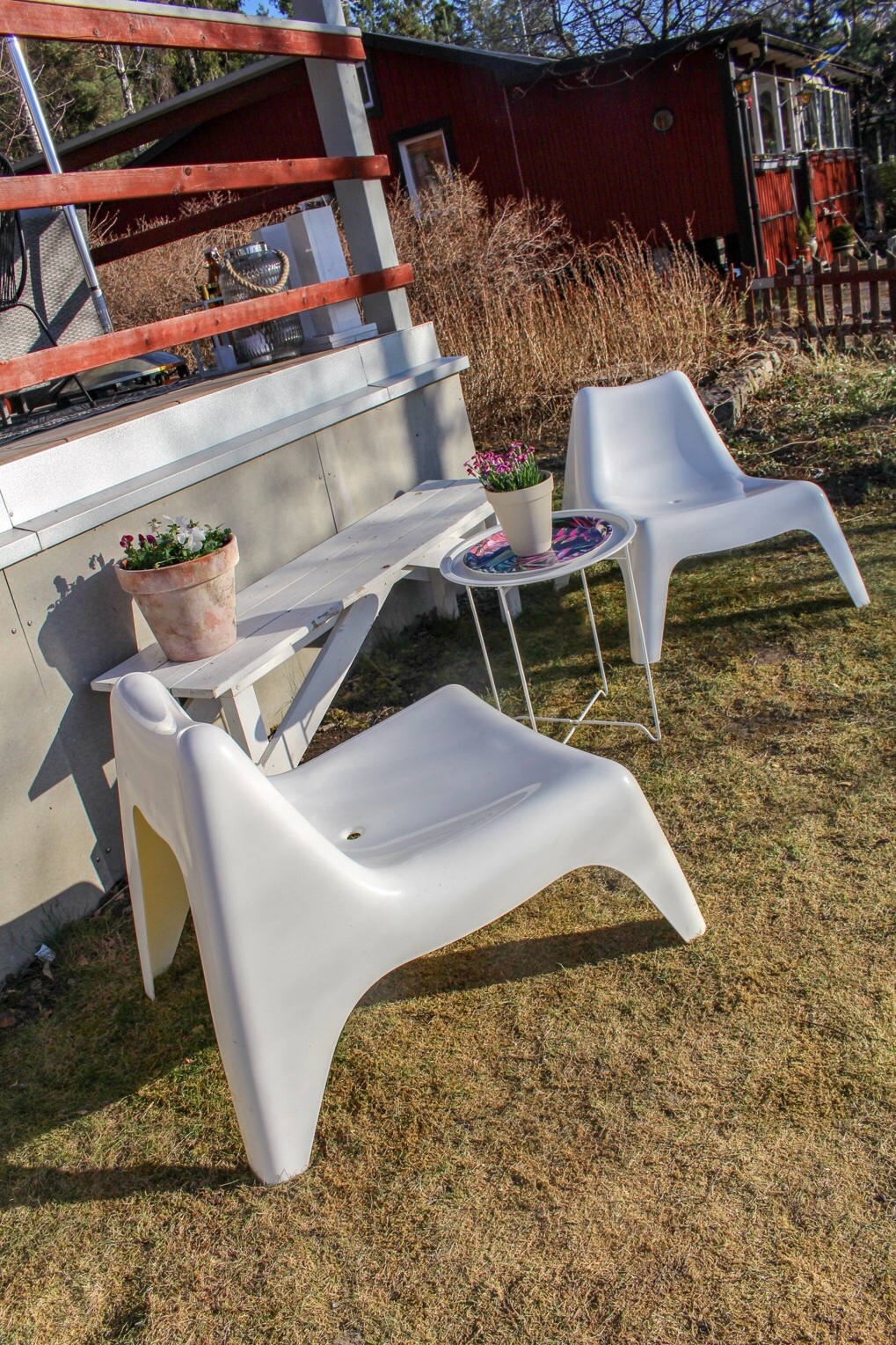 Sen var det dags att ställa i ordning en liten mysig plats ute på gräsmattan också. Vi har grillen står precis runt knuten på altanen så då passar det perfekt med lite stolar och bord bredvid. Där kan man sitta och ta en öl medan grillen gör sitt och njuta av kvällssolen. Vi har en helt galet fantastisk kvällssol just där.