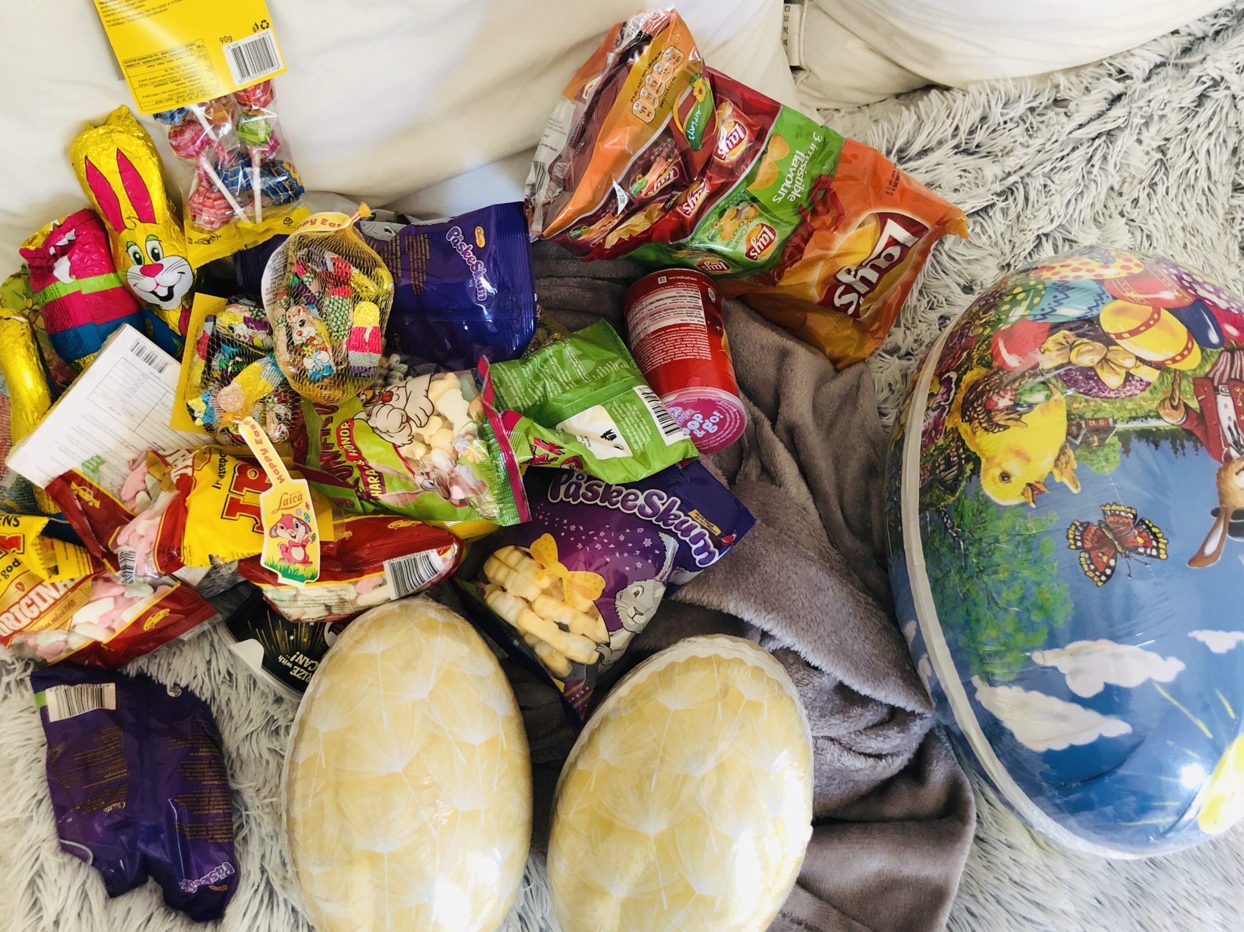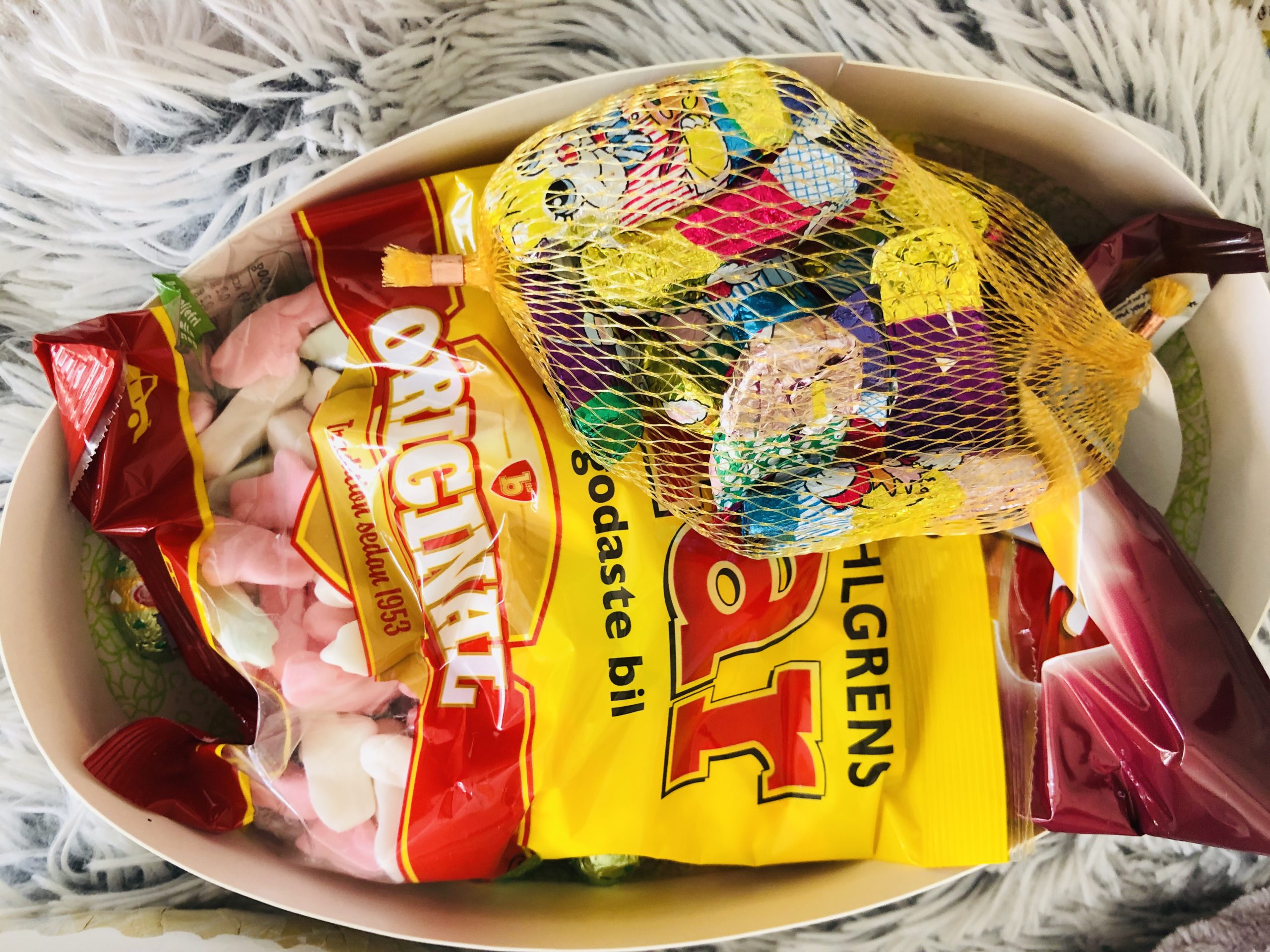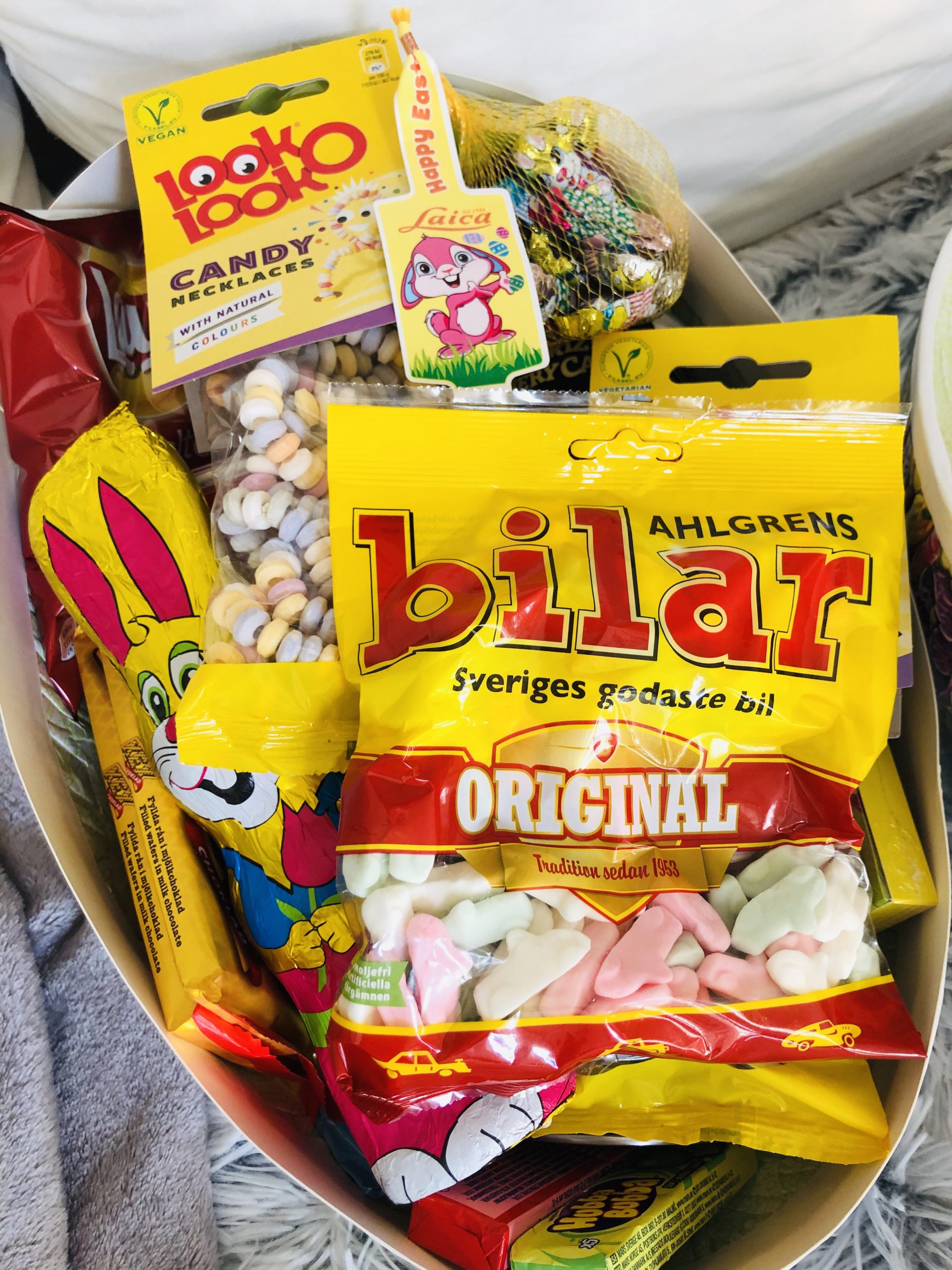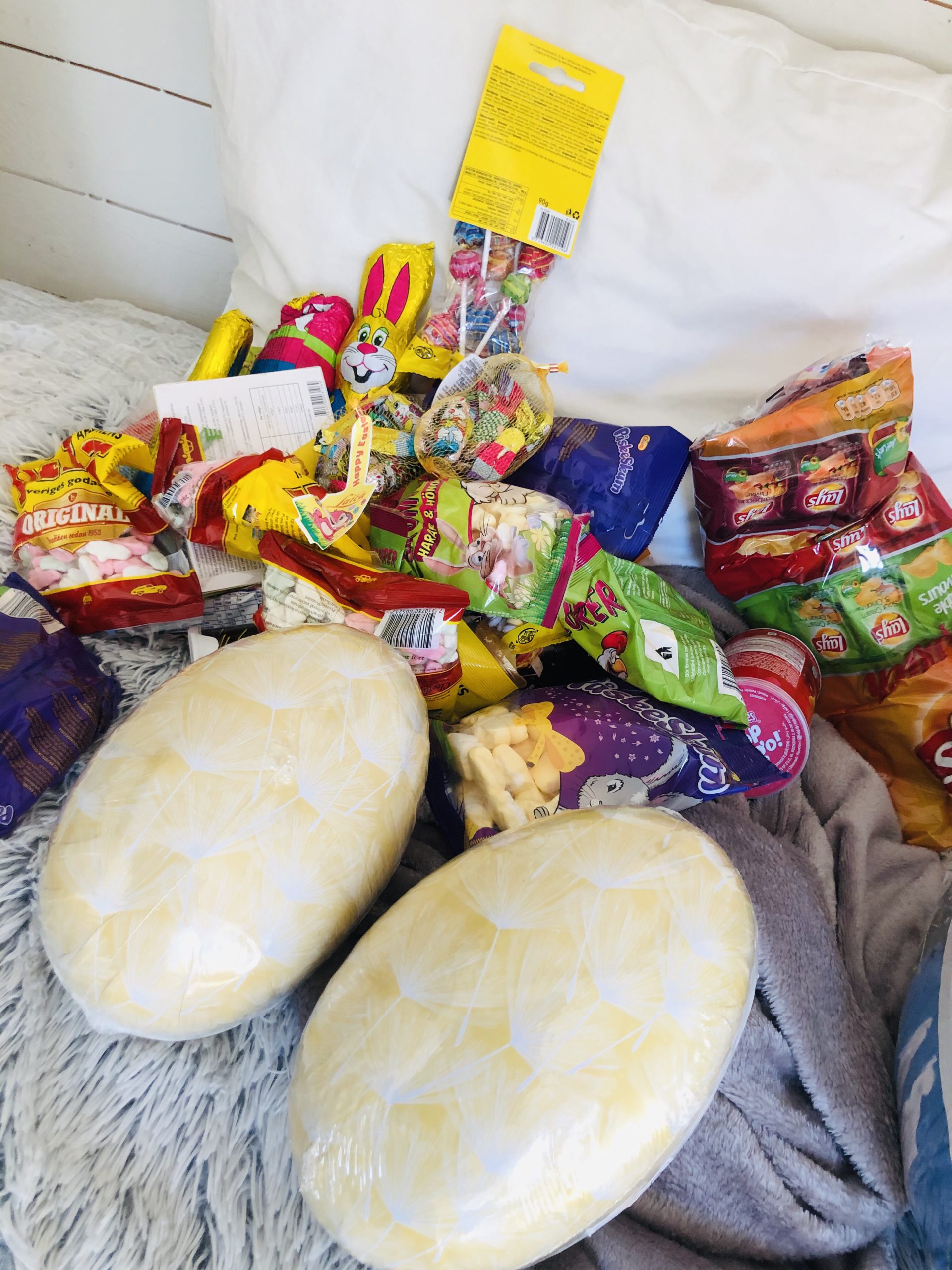 Jag gömde mig i arbetsrummet och packade äggen så han inte skulle se. Det känns lite som på julafton ju. Tony hade köpt lite väl mycket godis, hälften fick inte ens plats. Haha….
