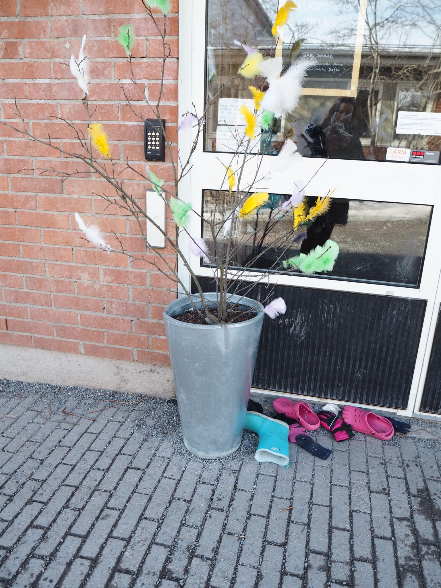 Dom hade gjort påskfint utanför dörren i skolan. Så mysigt ändå, måste börja påskpynta lite här hemma. Köpte faktiskt en gul rosbukett idag så jag har börjat lite smått.