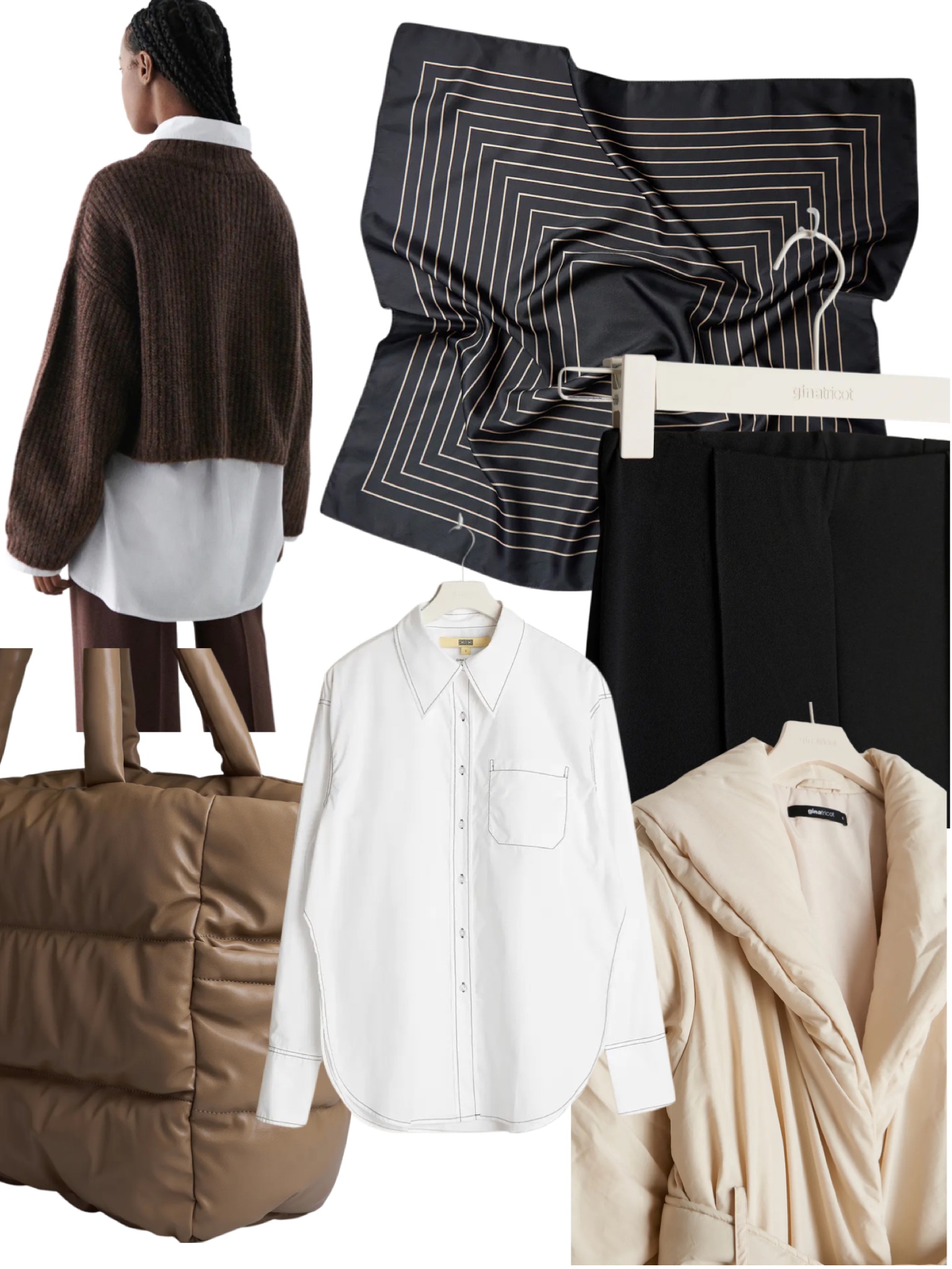 Brun stickad tröja // Scarf // Byxor // Vit blus // Väska // Kappa