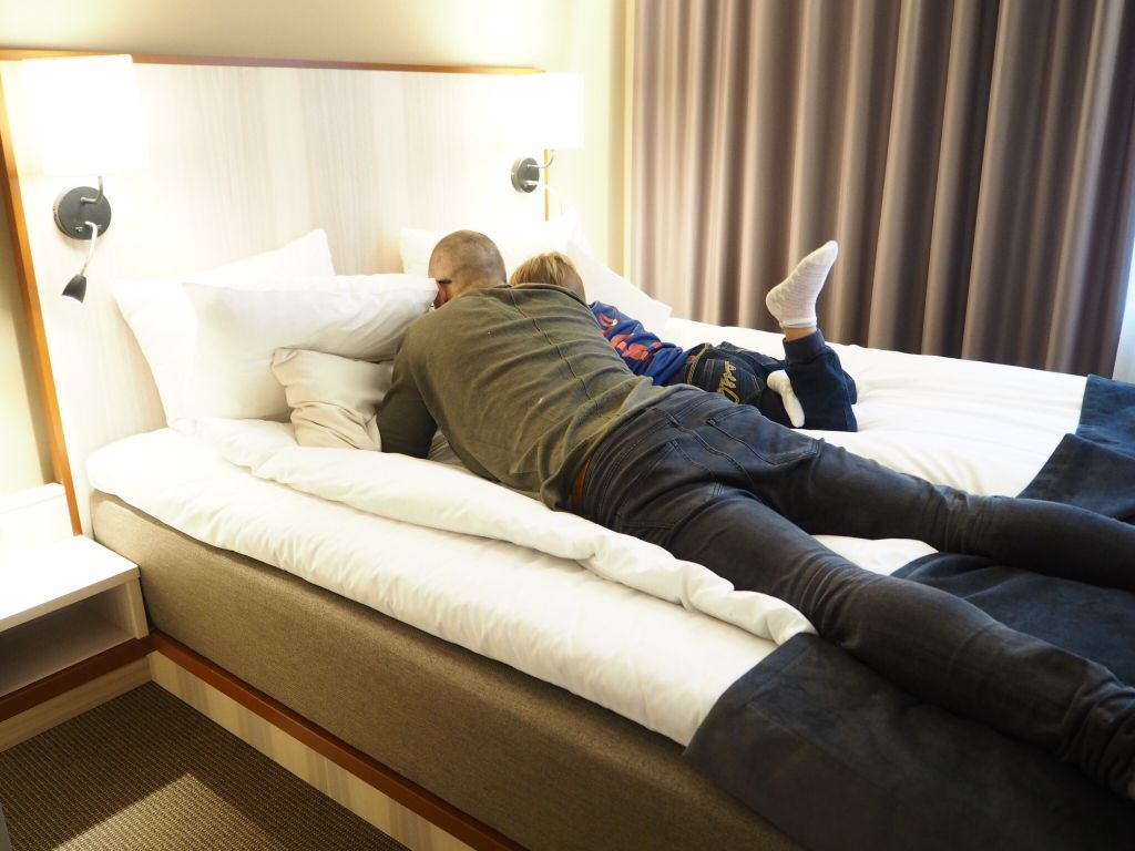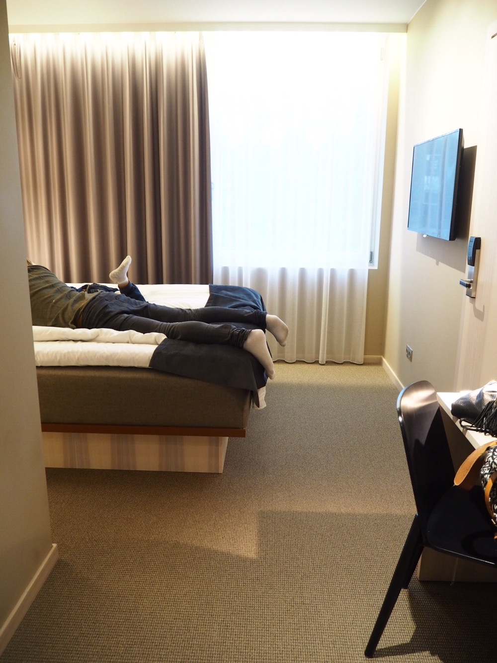 Nu har vi just landat på hotellrummet efter vi var och käkade middag i restaurangen. Milo vill hoppa och köra parkour i sängen och jag skulle helst vilja sova bara. 3 nätters värdelös sömn….det tar på krafterna. Dessutom har jag en begynnande förkylning igen. Blöööö…slår aldrig fel när man börjar träna. Men har druckit massa vatten idag och gurglat saltvatten.