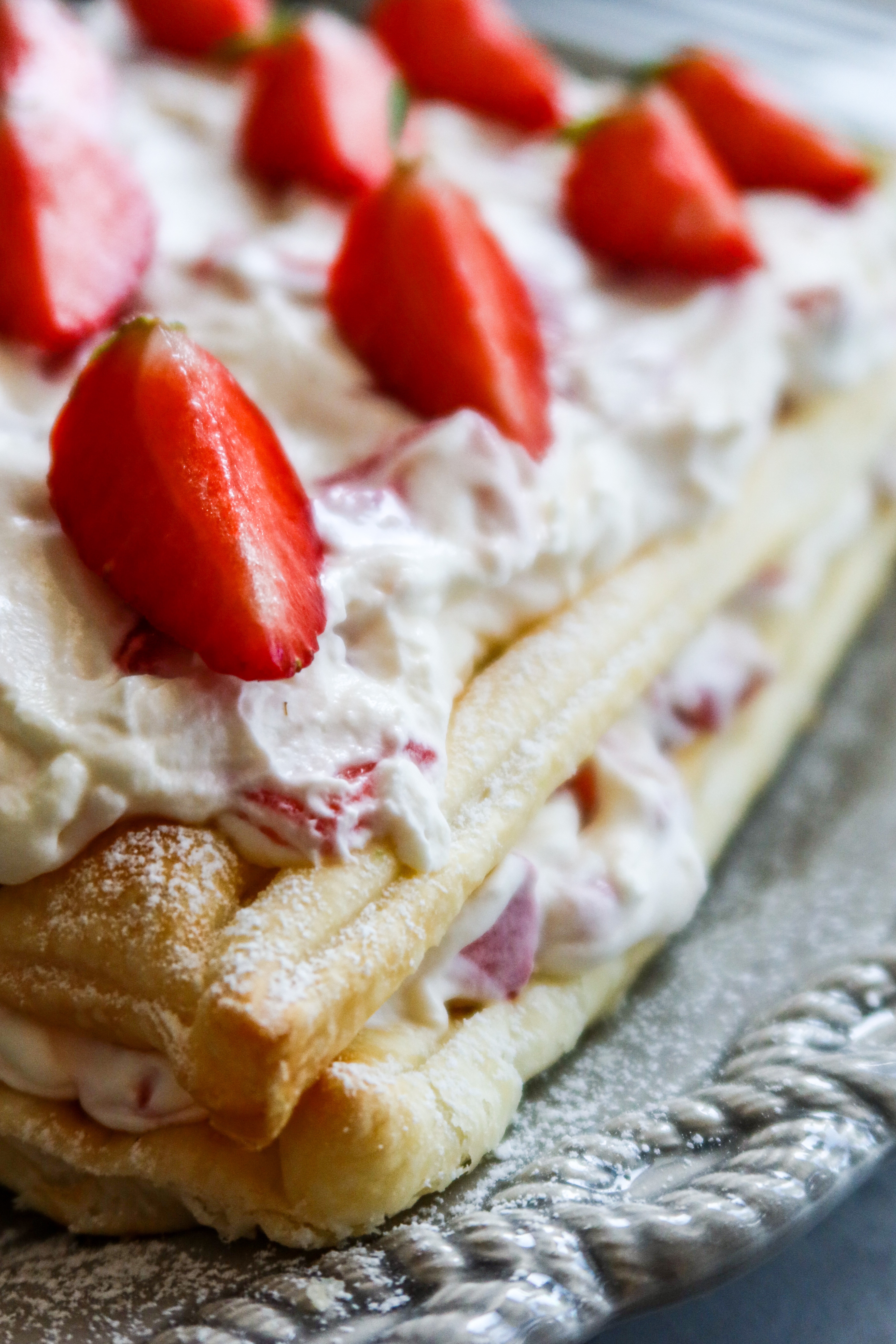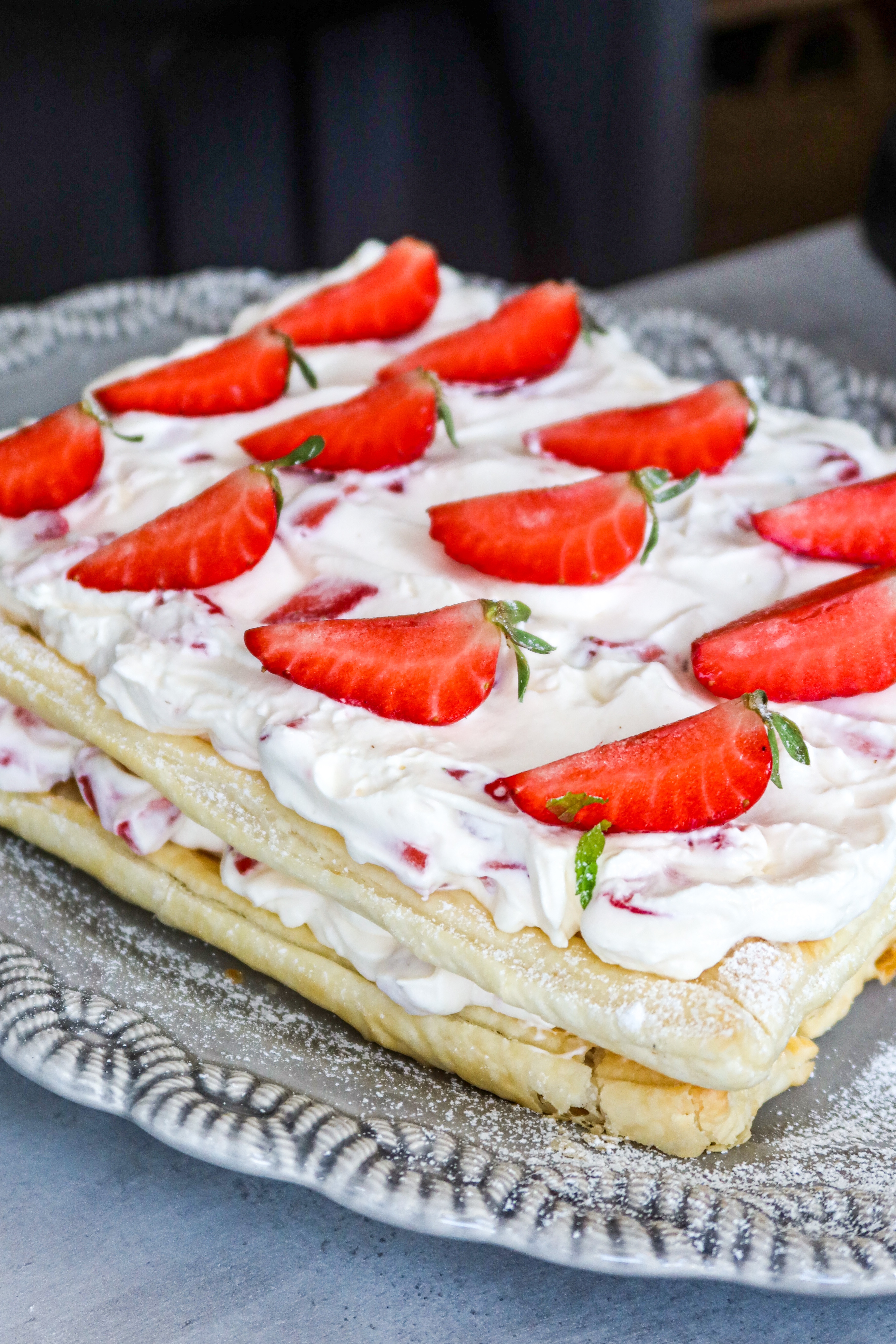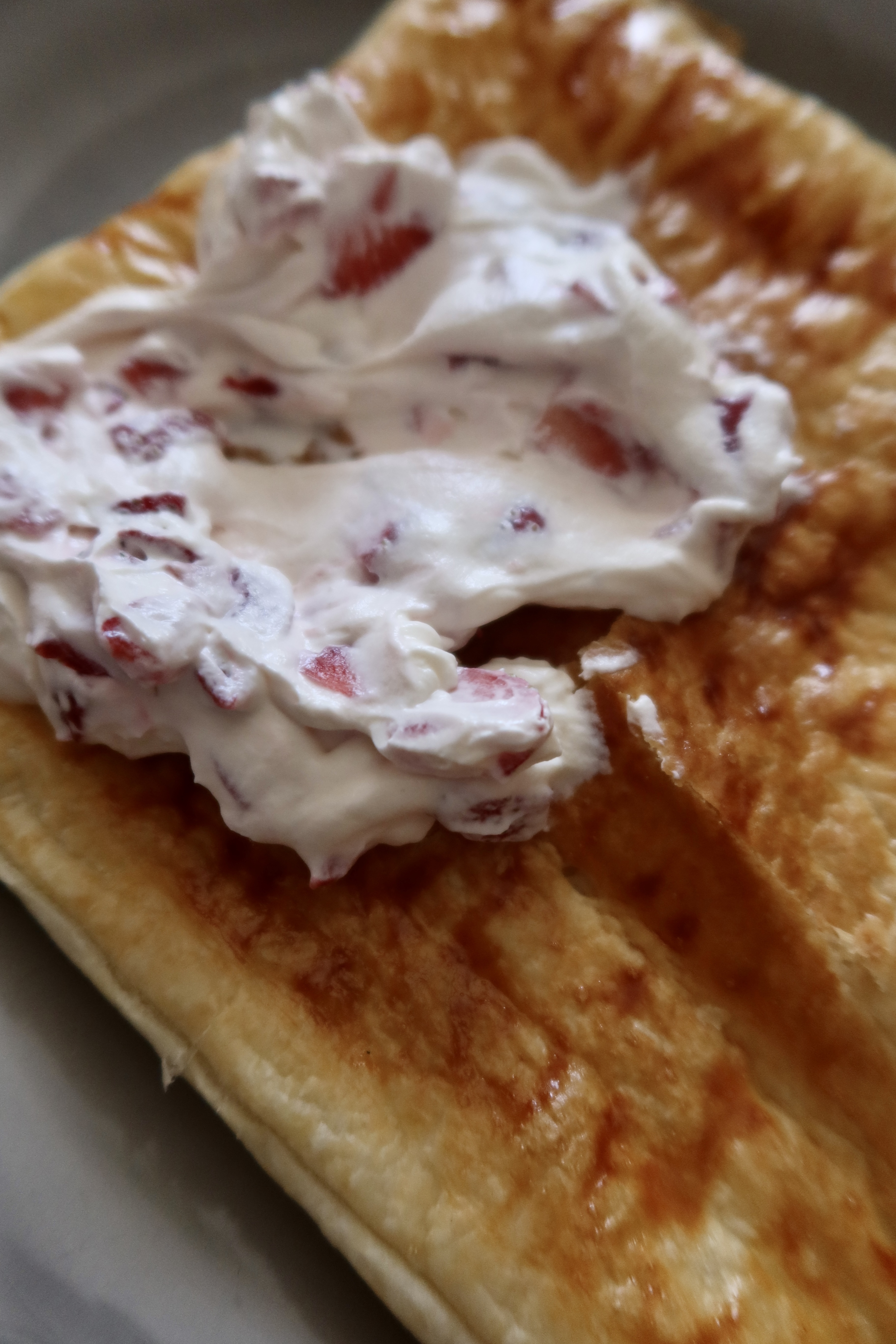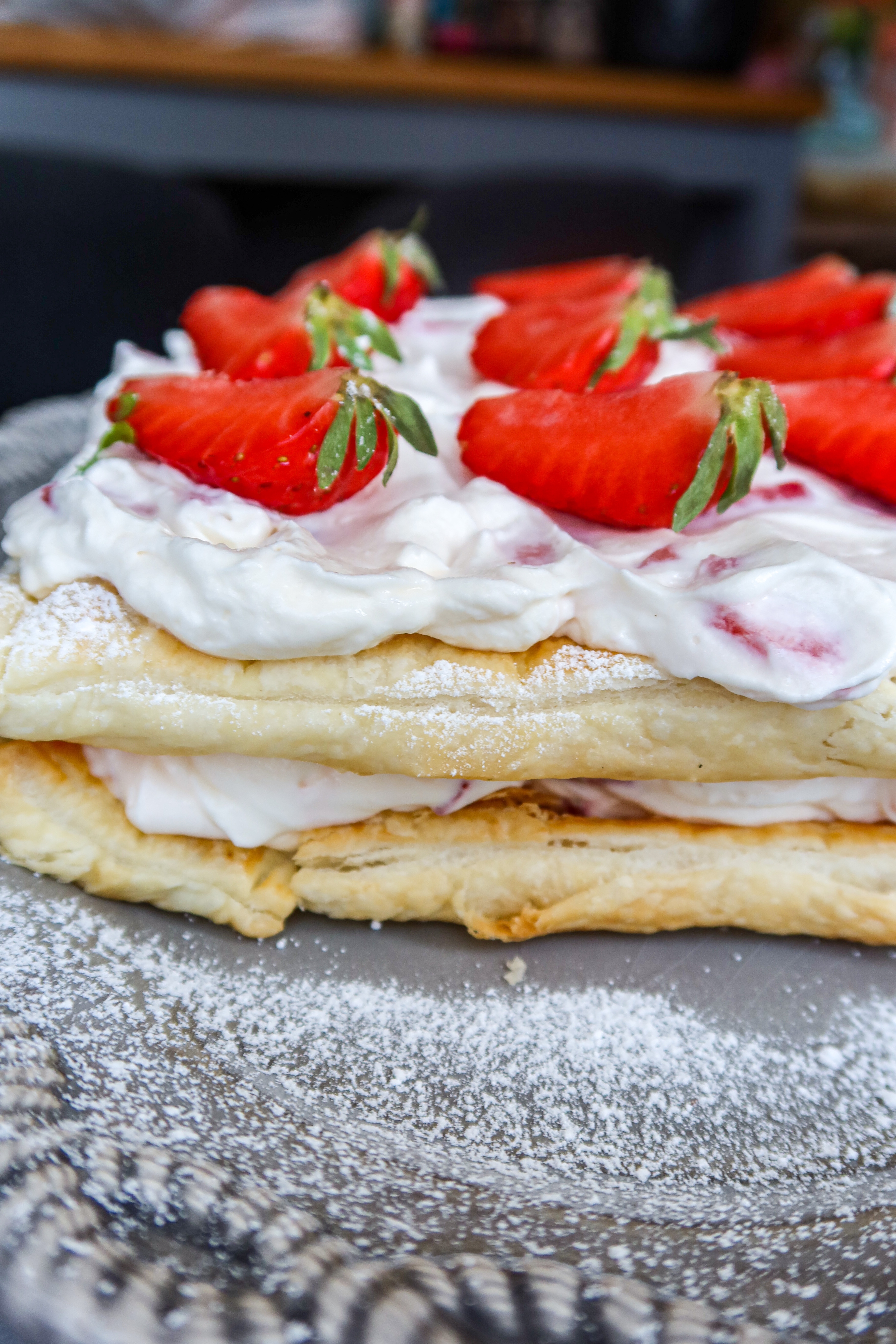 4) Bred på fyllning på en av smördegsrektanglarna. Ha på rätt tjockt. Lägg på den andra delen av smördegsrektangeln. Ha på fyllningen på den också. Toppa med några jordgubbar och lite florsocker.