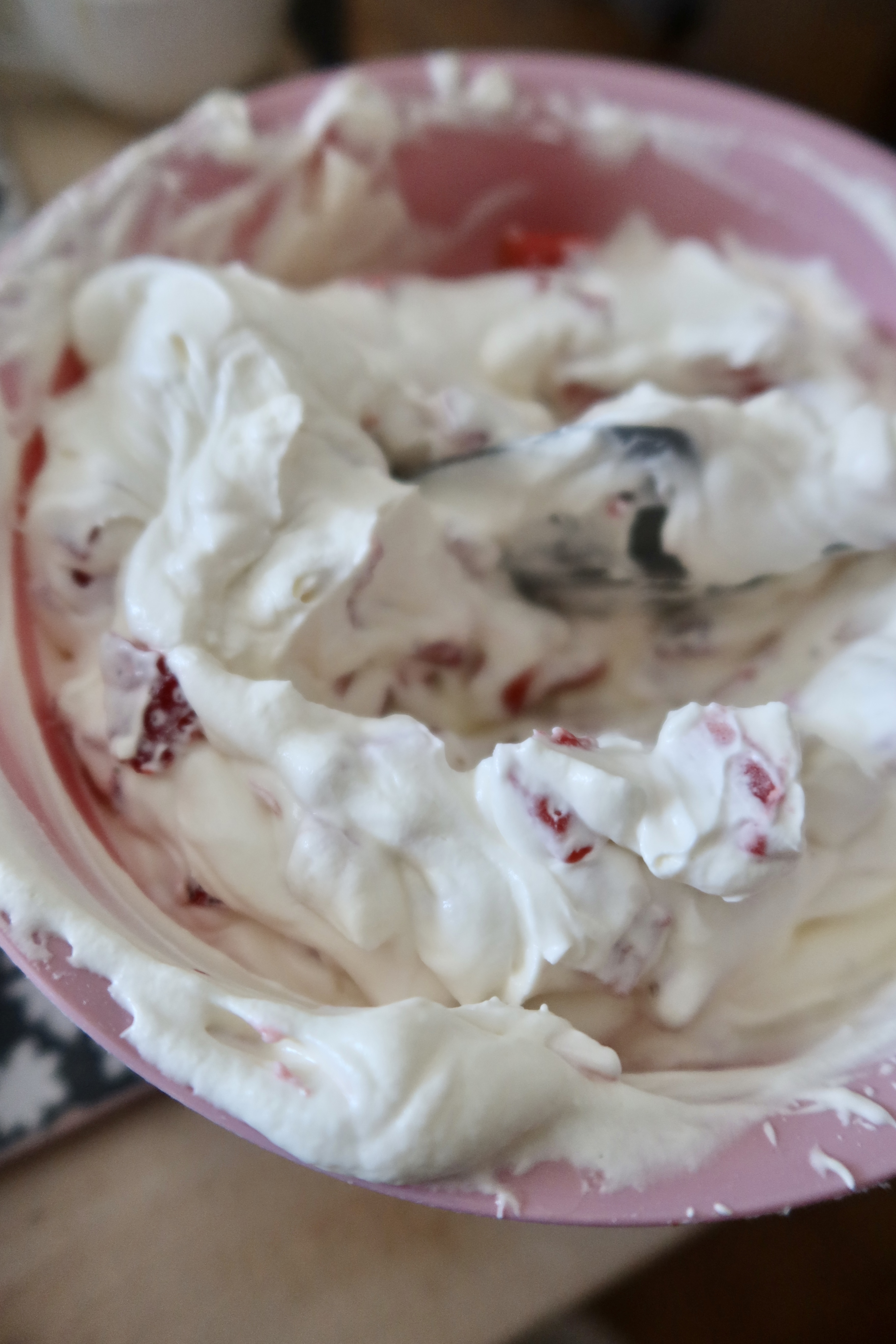 3) Tjoffa jordgubbarna i små bitar, spara några till dekoration. Ställ dem åt sidan. Blanda sedan i resten av fyllningen i en bunke. Ta fram elvispen och vispa tills du har en fluffig smet. Ha i jordgubbarna och blanda runt.