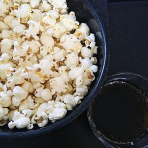 Cola Light och en stor risig plastskål med popcorn. Så gott! Hemmapoppade är godast.